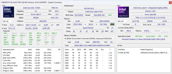 | MSI Venture 16 AI A2HMTG Intel Core Ultra 7 255H ⎘ Intel Arc Graphics 140T ⎘ 32 GB Memory | Amazon: List Price: 1000 USD | 2.1 kg | 23.15 mm | 16.00" 1920x1200 142 PPI IPS | |