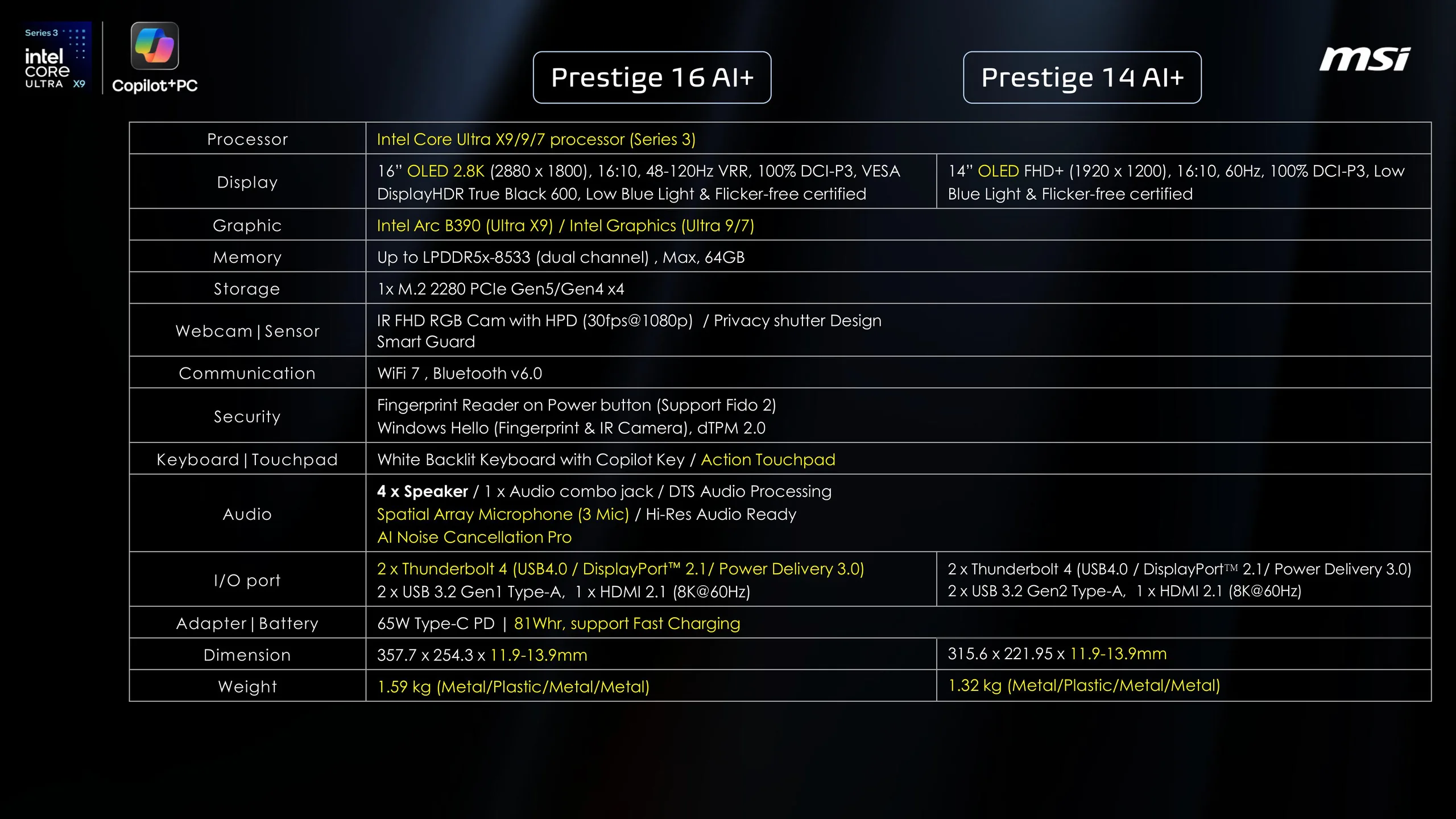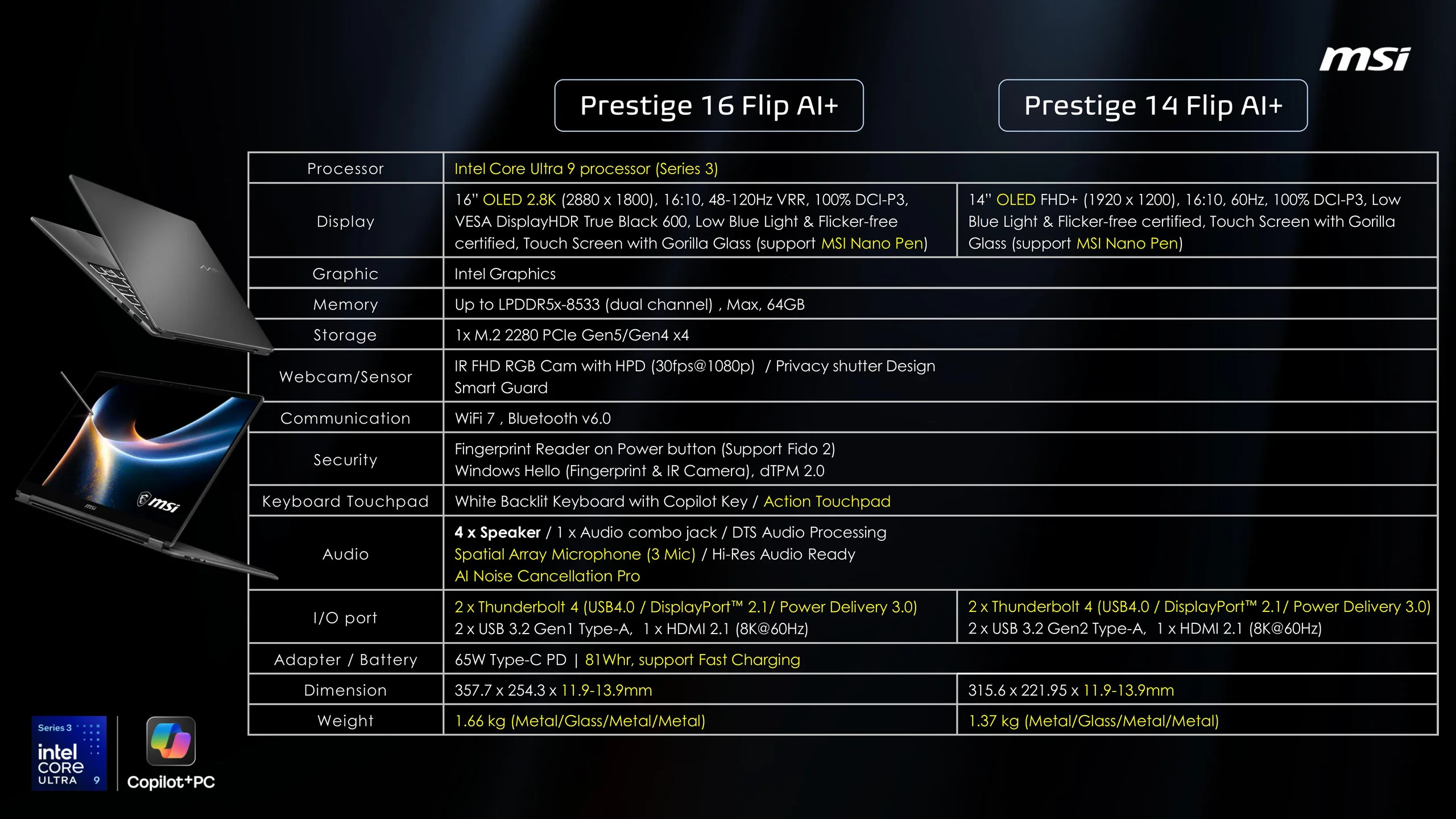 Prices start from $1,399 for the Prestige 16 AI+ and $1,629 for the Prestige 16 Flip AI+ with Core Ultra X9 CPUs. The Core Ultra 7 variant of the Prestige 16 Flip AI+ will retail at a starting price of $1,549.