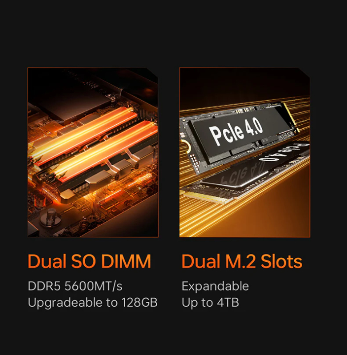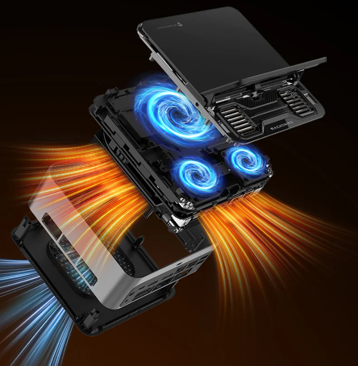 Machenike intends to sell the GTS as a barebones system without any RAM or storage to match peers like the GMKtec Evo-T1 (curr. $999 on Amazon) that we reviewed earlier this year. Alternatively, the mini-PC is said to be configurable with up to 128 GB of RAM and 2 TB storage via SODIMM and M.2 2280 slots. As the image below shows, Machenike has packed the GTS with plenty of ports too, despite its 147 x 147 x 61 mm case size.