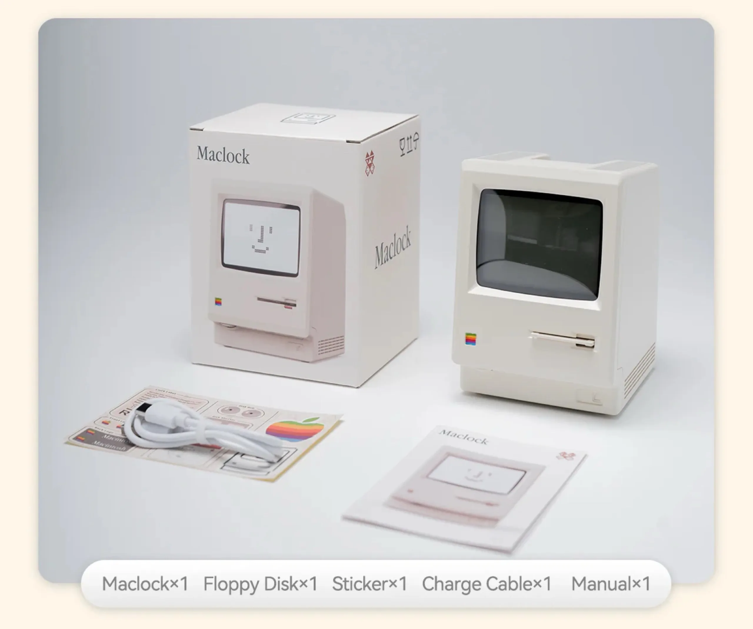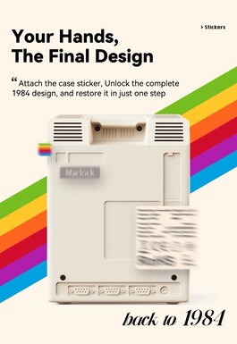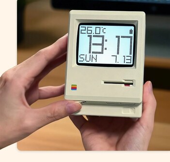 The display shows the time and date by default, but Maclock can also be used as an alarm clock. The digital clock's case measures 8 x 9.1 x 11.2 centimeters. The stickers on the back of the case have to be applied by the buyer. Kokogol Maclock is only being produced in limited quantities; once sold out, it will no longer be available.