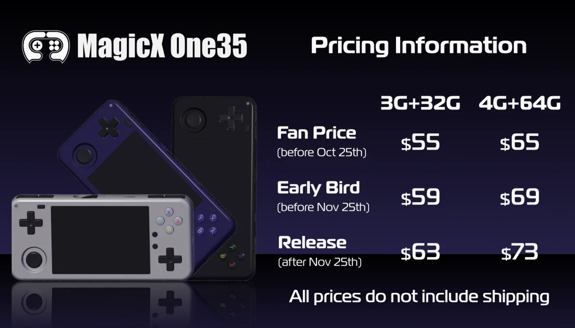 Meanwhile, all configurations come with a 4,300 mAh battery that supports up to 10 W USB Type-C charging, as well as a 3.5-inch IPS display that resolves at 960 x 640 pixels with 700 nits peak brightness. On top of that, MagicX has included a Hall effect joystick, dual d-pads for Tate emulation and stereo speakers, all within a 153 x 70 x 19 mm housing that weighs 189 g.