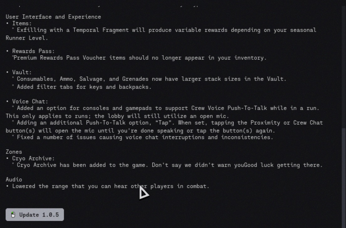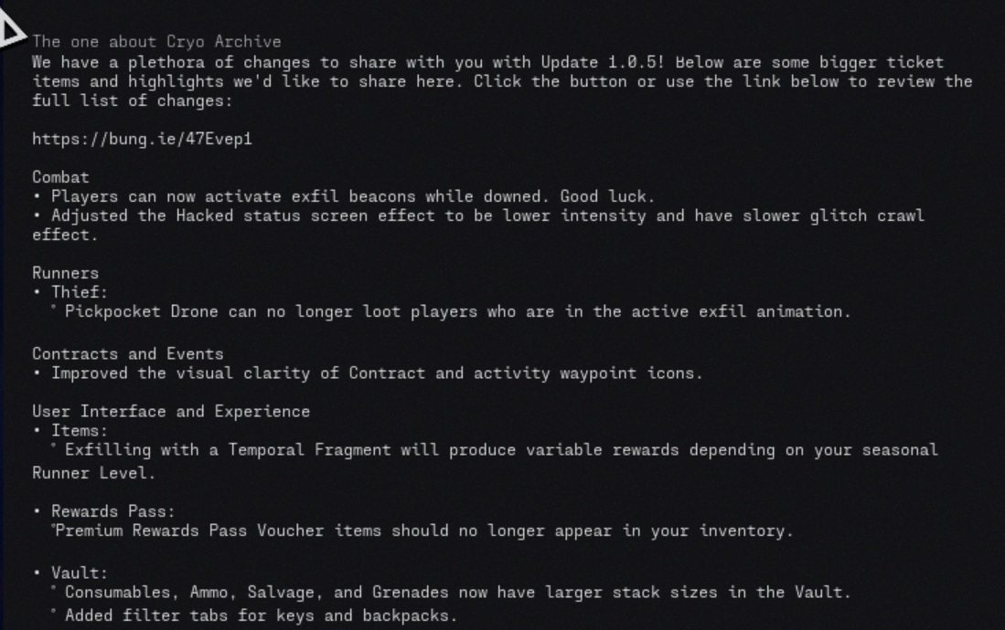 Marathon update 1.0.5 adds the new Cryo Archive zone, lets players activate exfil beacons while downed, and rolls out a long list of changes across combat, contracts, UI, voice chat, stability, weapons, mods, and audio. Bungie also tied several new loot additions directly to Cryo Archive, including implant perks and mods that can only be found there.