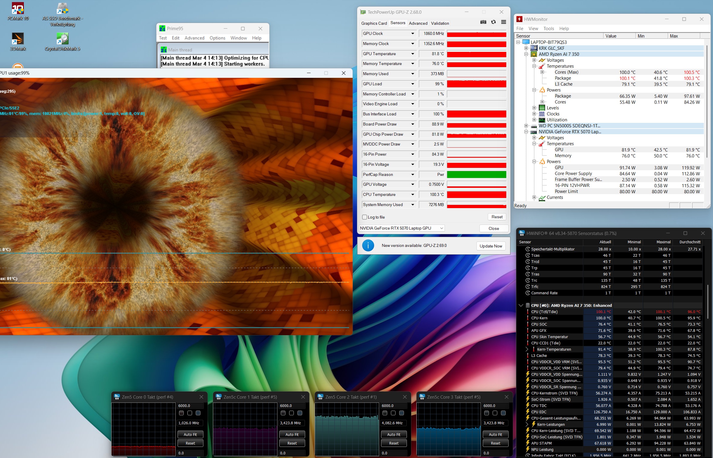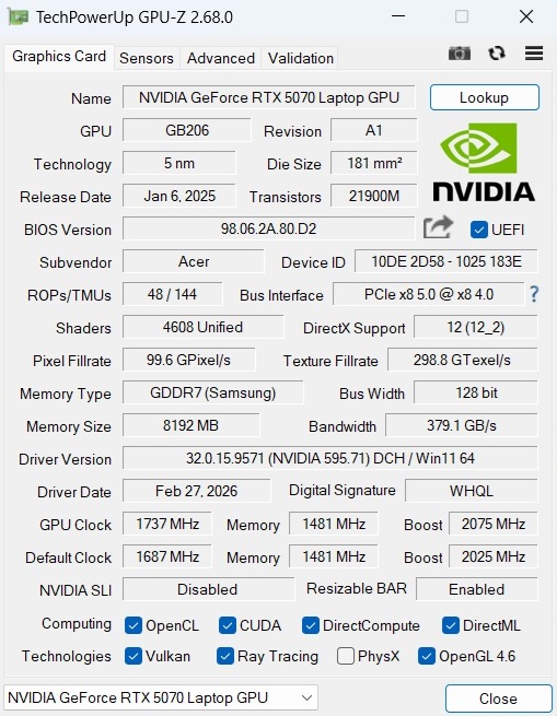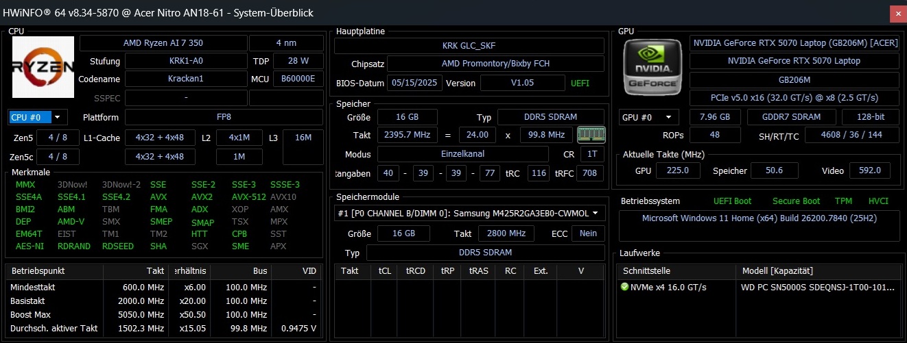 | Acer Nitro 18 AI AN18-61-R10V AMD Ryzen AI 7 350 ⎘ NVIDIA GeForce RTX 5070 Laptop ⎘ 16 GB Memory, 1000 GB SSD | Amazon: List Price: 1900 EUR | 3 kg | 25 mm | 18.00" 2560x1600 168 PPI IPS | |