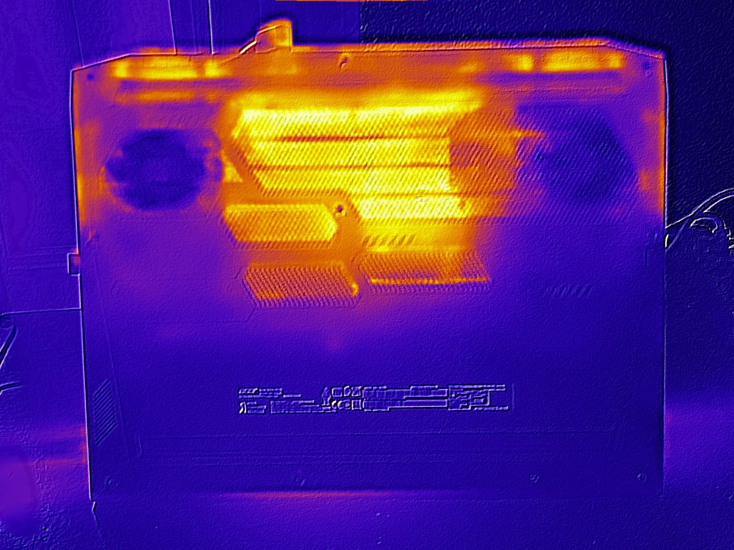 Under load, the top in particular heats up. A maximum of 44 °C (111.2 °F) contrasts with a maximum of 57 °C (134.6 °F) on the bottom of the casing. With these values, the 18-incher is ahead of the competition. Meanwhile, there are hardly any differences between the competitors in idle mode.