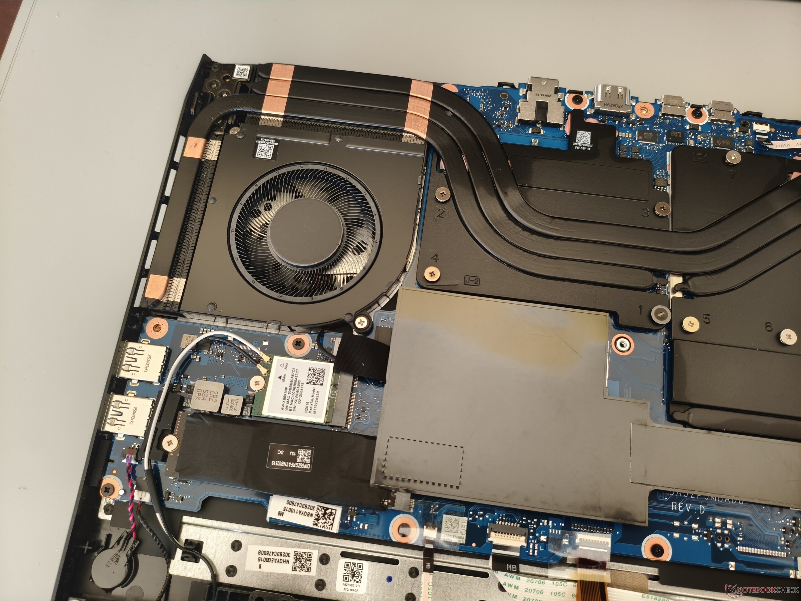 The wireless module from MediaTek (Wi-Fi 6E) performs particularly well in terms of reception. Thanks to its Full HD resolution, the webcam is somewhat sharper than on many other gaming laptops, but it is still not really impressive. To access the inner workings, 10 Phillips screws have to be removed. Our pictures reveal what it looks like under the hood.