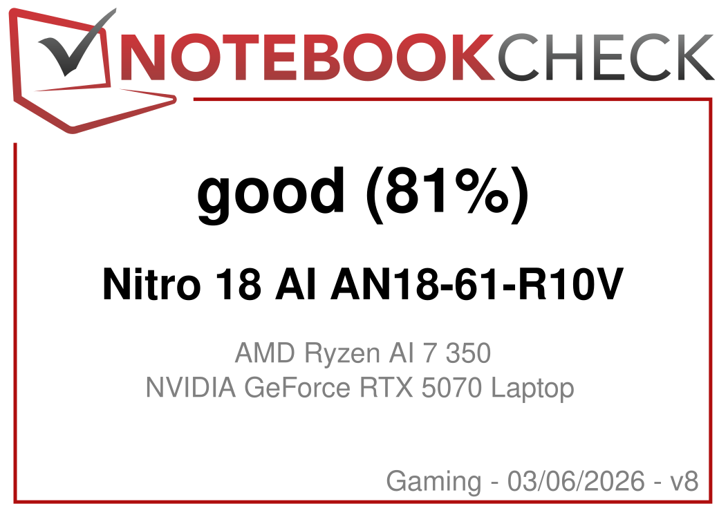 The Nitro 18 AI turns out to be a good gaming laptop in 18-inch format in the tested version with Ryzen AI 7 350 and GeForce RTX 5070, which has almost no significant weaknesses. For example, the slow card reader and high latencies will only affect some users. The fact that the mid-range model is very loud in the Performance and Turbo system modes is also bearable, as the fans remain significantly quieter in Balanced mode, while the CPU and GPU hardly lose any speed.