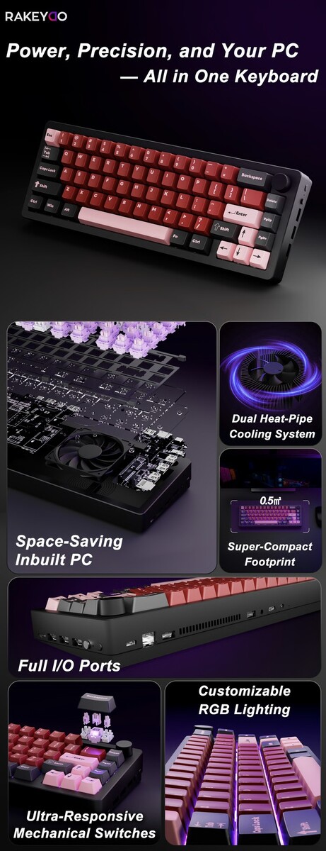 Rakeydo installs red switches on its mechanical keyboard, which also features integrated RGB backlighting and thus up to nine different lighting effects. Supporters of the campaign can choose between various storage configurations, namely 512 GB, 1 TB or 2 TB. All configurations come with 16 GB of RAM, various ports for monitors, micro SD cards, audio cables and other peripherals, as well as Windows 11 Pro. Prices start at around $399 as part of the "Super Early Bird" special offer, plus shipping.
