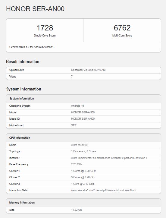 The device tested is listed with the identifier "Honor SER-AN00", and is equipped with 12 GB of RAM. Performance-wise, the Dimensity 8500 does not appear to significantly outperform the Dimensity 8400. The chipset delivers a single-core score of 1,728 on its best run, and a multi-core score of 6,762. Comparatively, the Dimensity 8400 averages scores of 1,621 and 6,208 on those same tests.