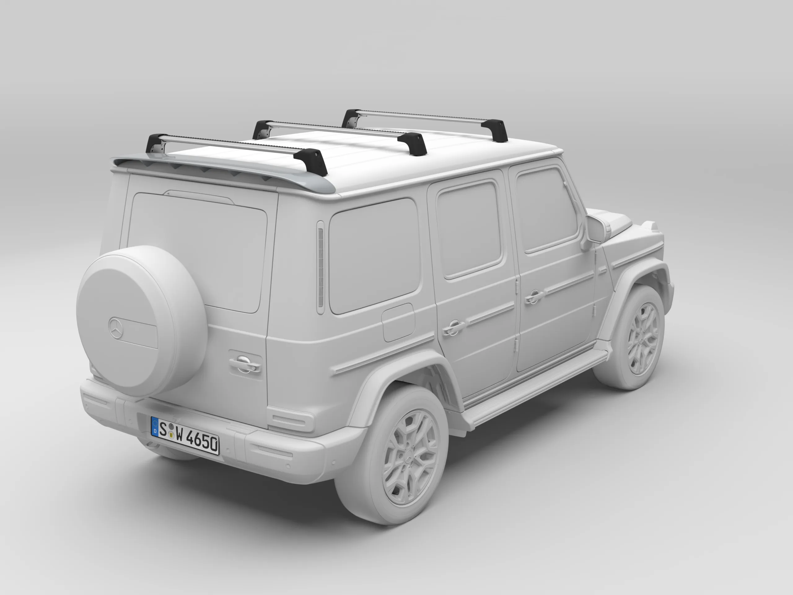 Despite the heavy camouflage of the prototype, round daytime running lights are visible at the front, which are also modeled after the full-size G-Class and are recessed accordingly. Furthermore, there are roof rails, and the sides feature prominent wheel arches, three side windows on each side and bow-shaped door handles.