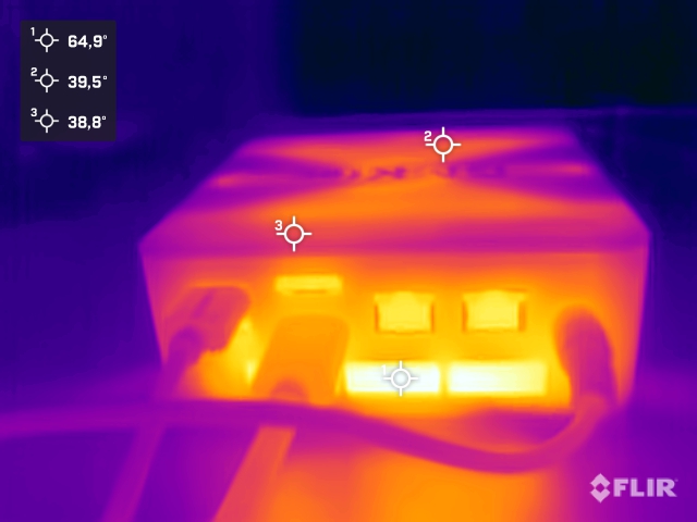 Under load, the case of the GMKtec NucBox M6 Ultra heats up noticeably, but without reaching critical temperatures. In the stress test, the AMD Ryzen 5 7640HS initially rises to just over 86 °C, but then stabilizes at around 80 °C. The power consumption remains constant at the limit of 45 watts.