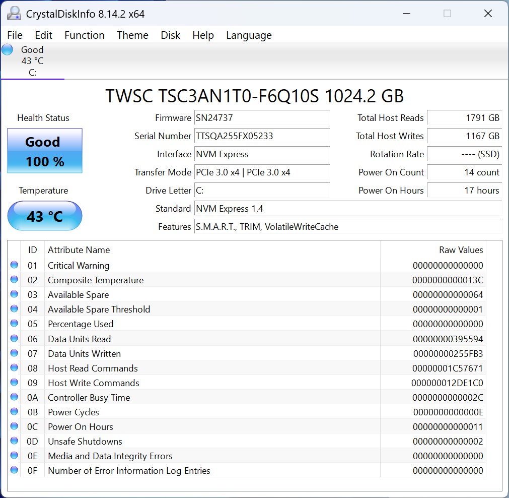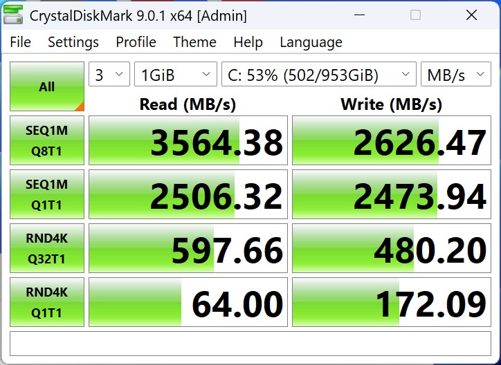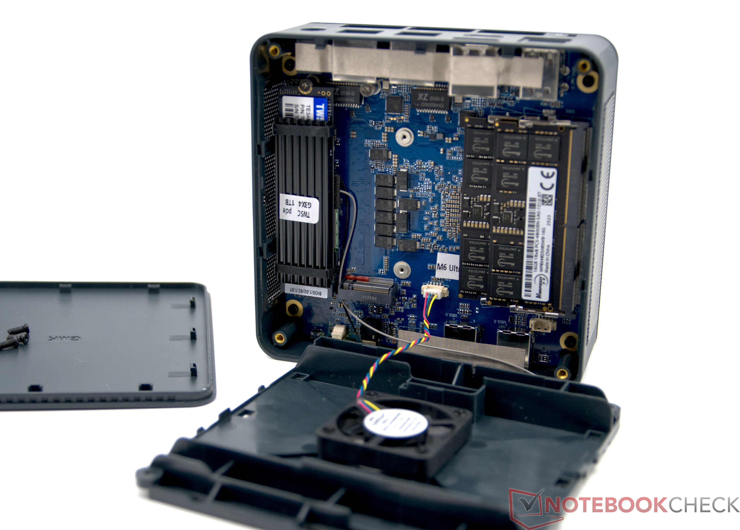 The GMKtec NucBox M6 Ultra features a 1 TB SSD from TWSC. The mass storage device works with PCIe 3.0 x4 and delivers decent transfer rates that are sufficient for everyday use. The active cooling unit ensures sufficient cooling under load so that no loss of performance is to be expected. The Mini-PC also offers space for an additional M.2 2280 SSD.