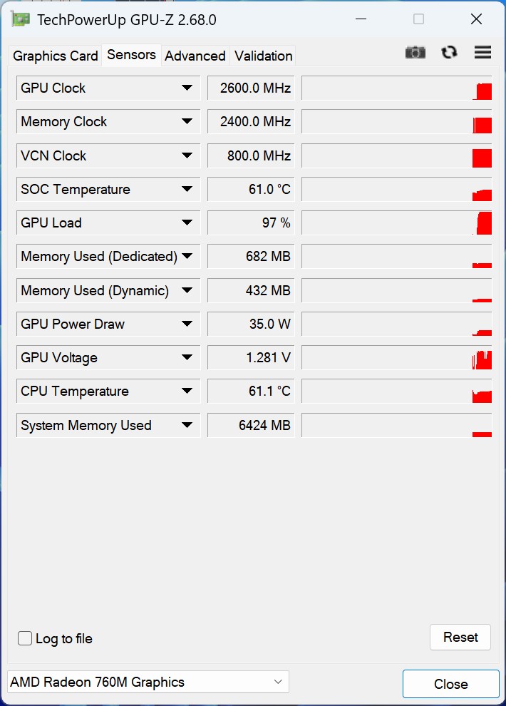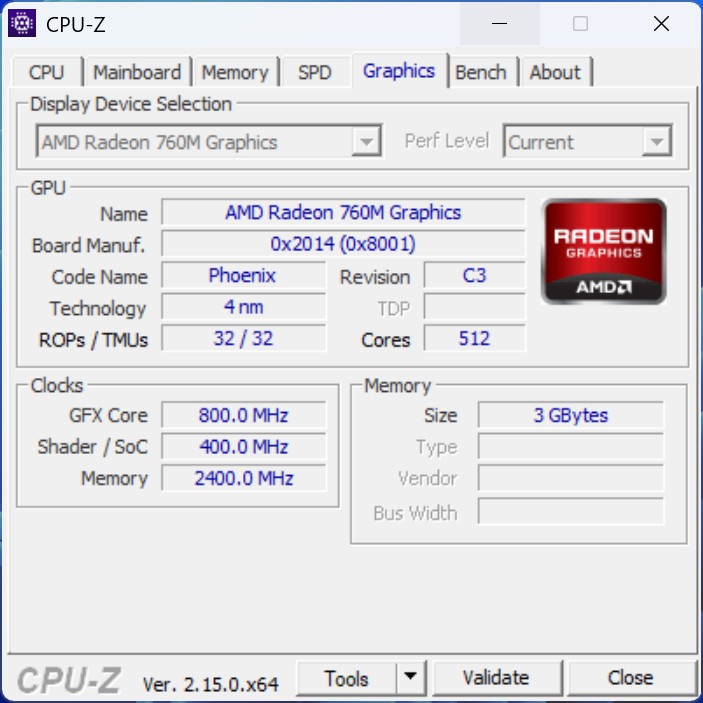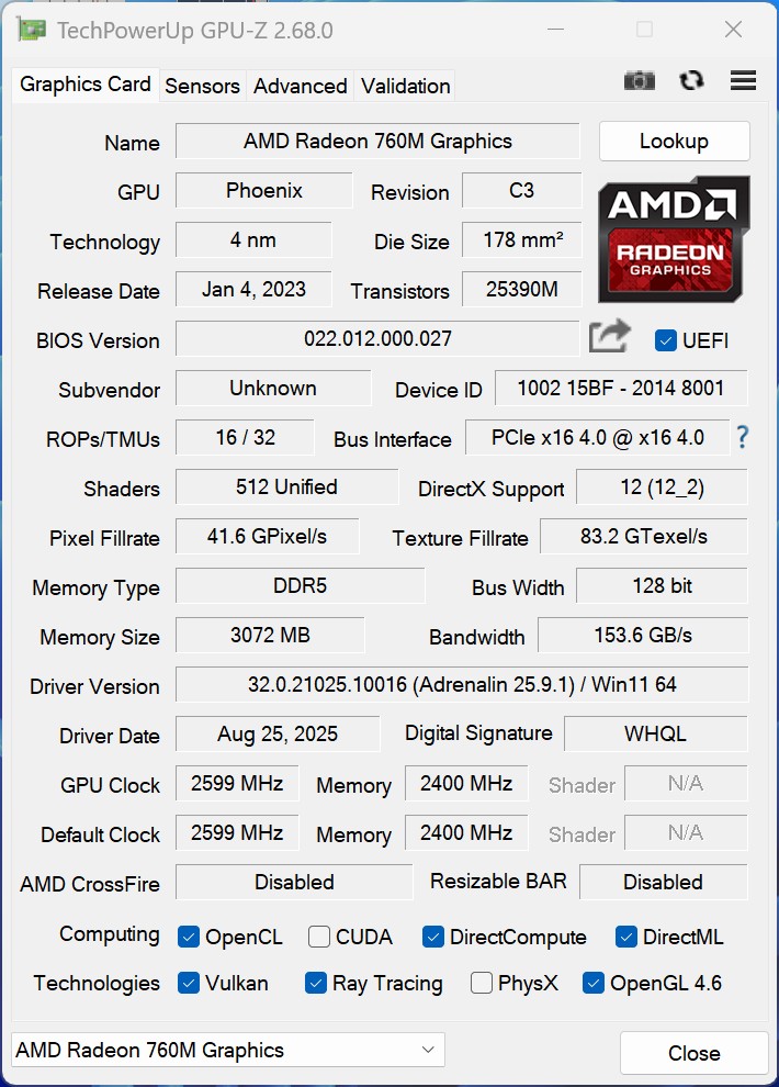 The GMKtec NucBox M6 Ultra relies on the integrated AMD Radeon 760M, which delivers decent iGPU performance in everyday use. It achieves solid results in synthetic benchmarks, placing it in the midfield. In practical gaming tests, the iGPU performs adequately, although this is very dependent on the game. However, the Radeon 760M is clearly beaten by the more powerful integrated graphics units such as the AMD Radeon 890M or even the Radeon 8060S.