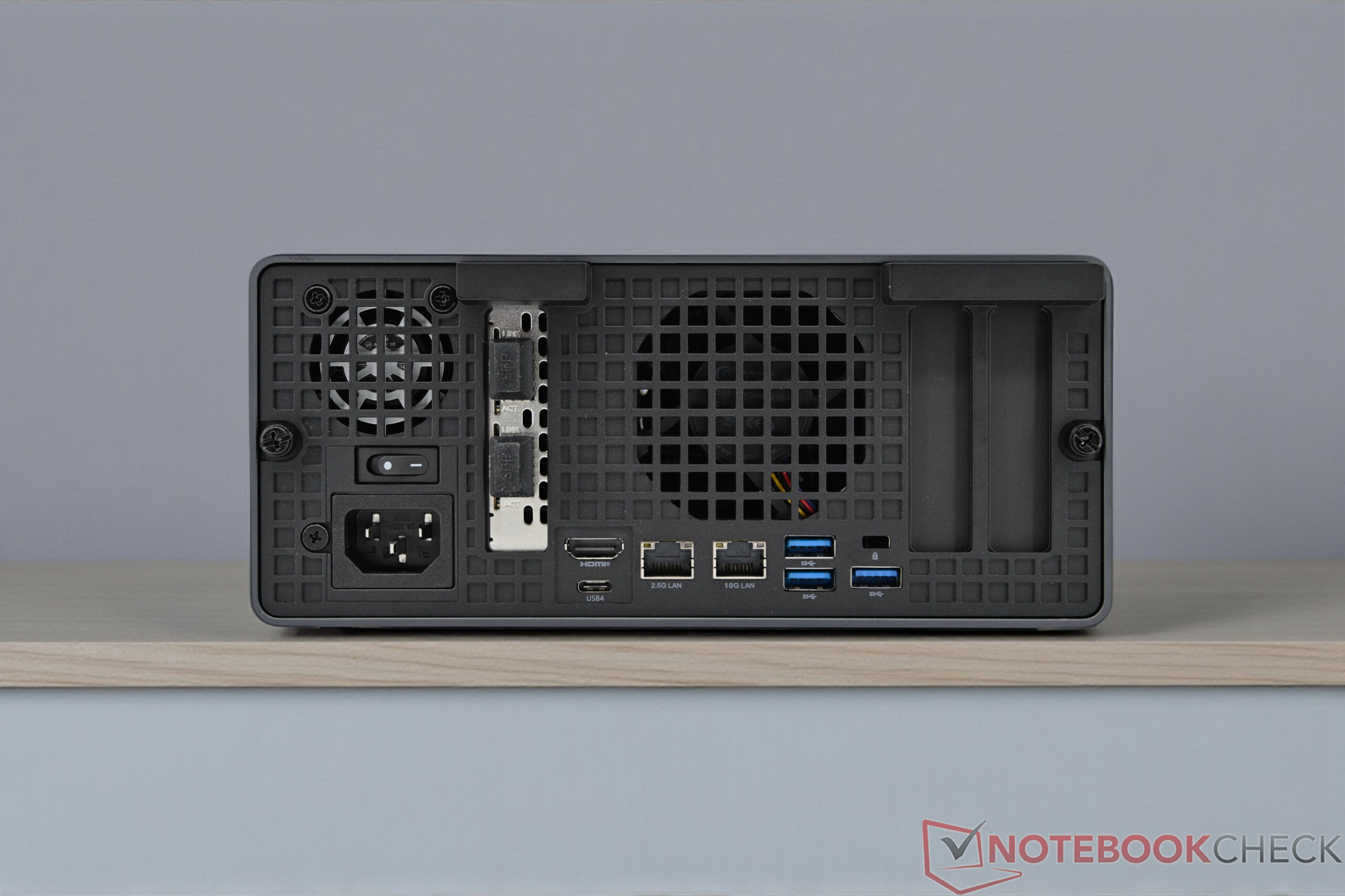 The Minisforum MS-02 Ultra impresses with a high-quality housing that harmoniously combines metal and plastic and leaves a professional impression. The mini PC is also extremely generously equipped in terms of connections: several modern high-speed ports, including USB4 V2, ensure maximum flexibility for peripherals and external extensions. The network equipment is particularly noteworthy: in addition to 2.5 Gigabit and 10 Gigabit LAN, the system has two SFP+ ports that enable transfer rates of up to 25 GbE. The compact system also allows a dedicated graphics card to be installed in a compact SFF format.