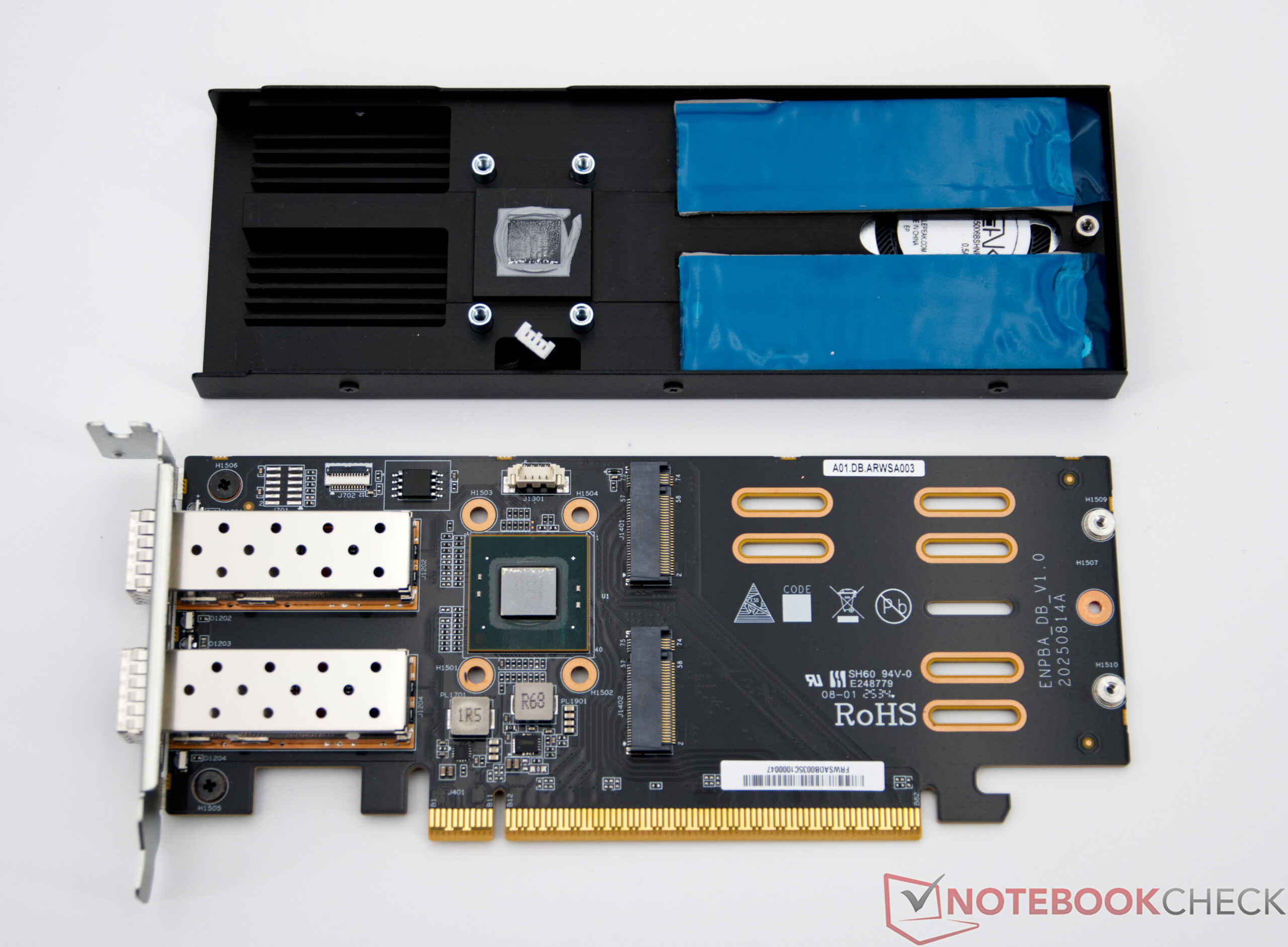 The accessories are few and include two cables (IEC and HDMI connection cables) as well as another passive SSD cooler in a particularly flat design. The top model is also equipped with a PCIe plug-in card, which offers space for two additional M.2 SSDs in addition to the two SFP+ ports. This adapter card is not included with the Minisforum MS-02 Ultra with Intel Core Ultra 7 275HX CPU.
