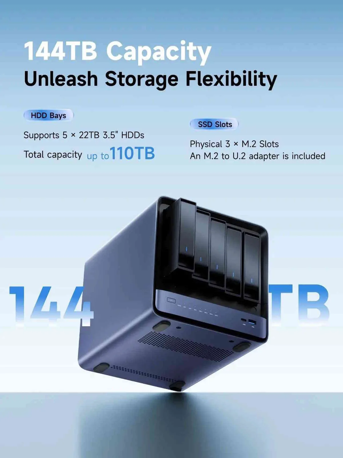 The Minisforum N5 Air offers five bays for traditional HDDs and three M.2 slots for NVMe SSDs. An included adapter lets users install U.2 drives in the M.2 slots. Network connectivity is handled by two Ethernet ports rated for up to 5 Gbit/s and 10 Gbit/s, respectively. The NAS device supports Link Aggregation, though your existing network hardware must be fast enough to avoid significant bottlenecks elsewhere.