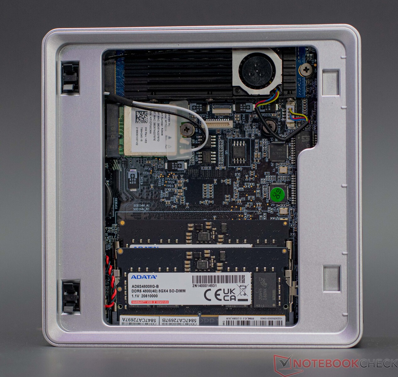 Performing maintenance checks on the Minisforum Venus Series NPB5 is super easy. As Minisforum also offers the device without RAM and an SSD, installing these proves to be no issue. The top can be removed without the use of tools, as the lid is only held on by two pressure points. The bottom, however, is held on by four screws along the base. They are situated beneath the stuck-on rubber feet - you first have to remove these, which can be a bit tricky. Although, you aren't actually supposed to remove this side anyway, as it only houses the CPU fan and cooling unit which utilizes liquid metal to optimize heat transmission.