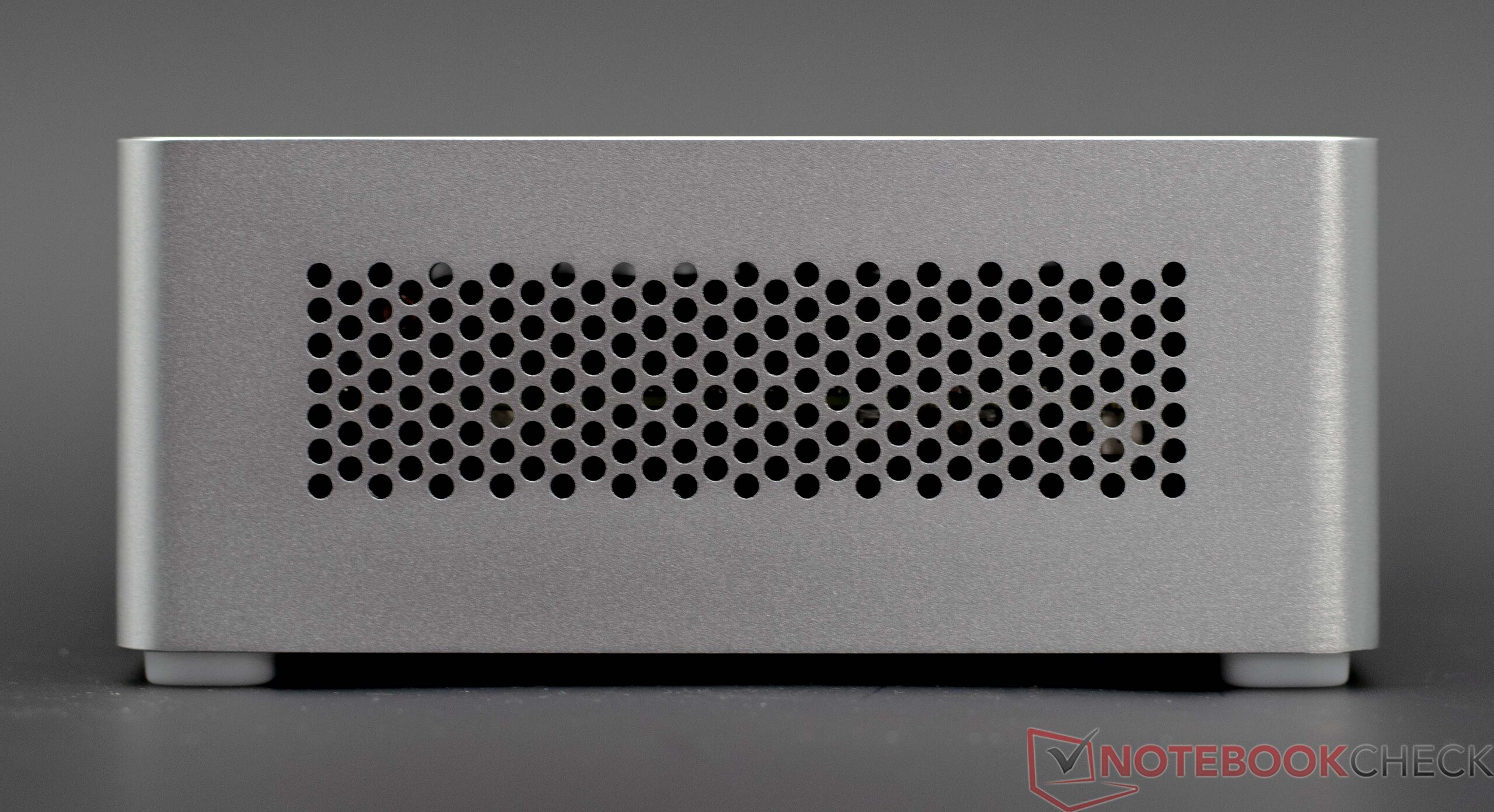 The Minisforum Venus Series NPB5's case only slightly heats up without being under load. On the other hand, the metal surfaces got quite hot during the stress test. On the right side as well as on the back, there are vents which shouldn't be covered when the device is in use. Thermic hotspots were thankfully kept within limits in these areas during our test.