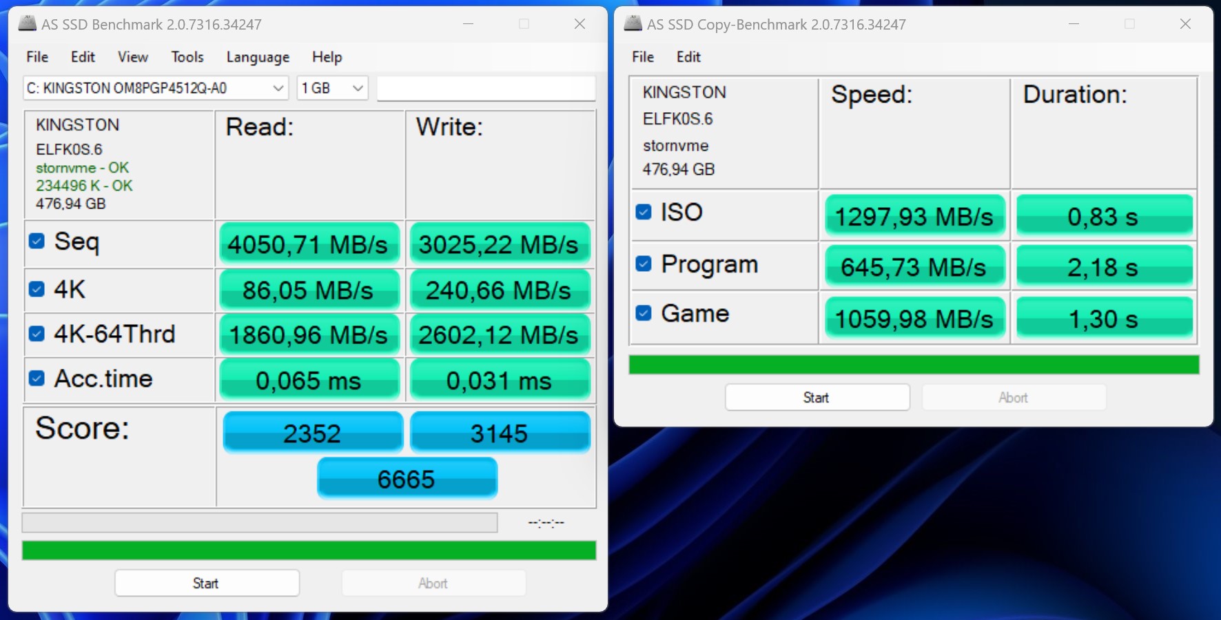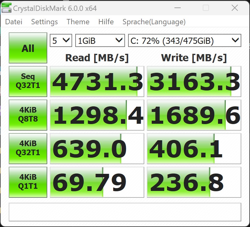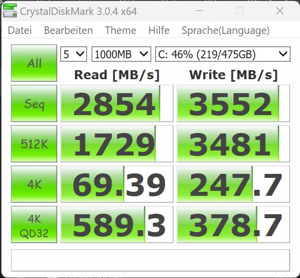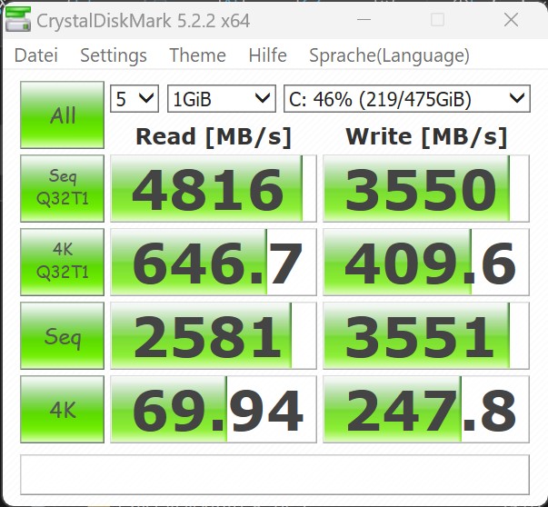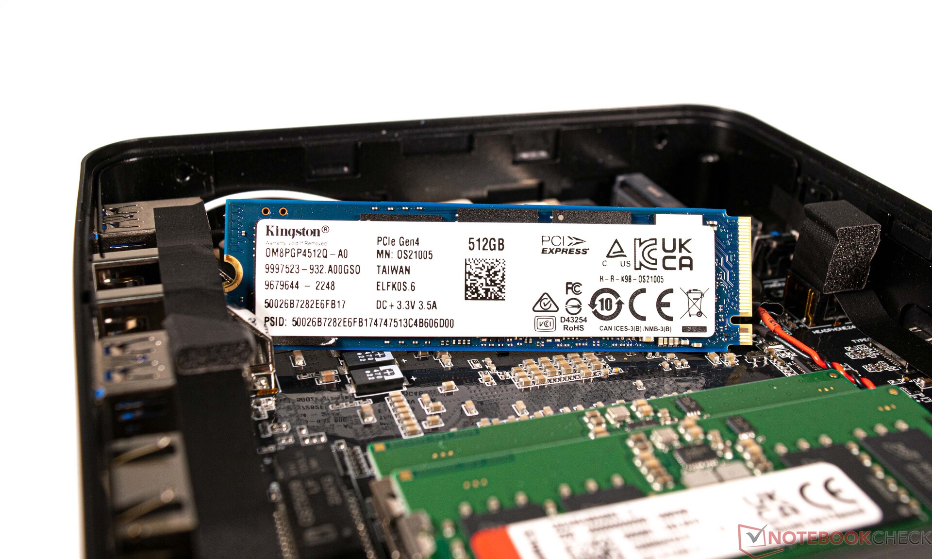 Our review sample of the UM690 comes with a 512 GB Kingston SSD. We have already seen the same model used in the Minisforum Neptune Series NAD9. The drive performs similarly well in the UM690 and is faster than the storage solutions in the rest of the comparison devices. However, the Kingston drive exhibited the same weaknesses under sustained load. The small heatsink isn't enough keep the drive's performance constant over an extended period. The Minisforum UM690 can also be fitted with an extra 2.5" storage drive; the required cable is included in the box.