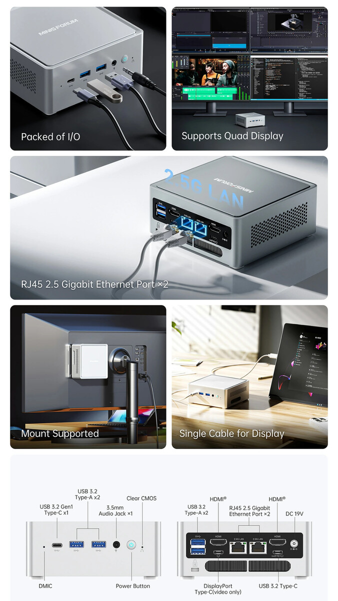 Moreover, the NAB3R supports upgradeable storage and RAM, albeit only up to 64 GB of DDR4-3200 in the latter's case. Nonetheless, Minisforum has included an active cooling solution for the mini-PC's M.2 2280 SSD, as well as a large turbo fan on its underside. As the image below shows, the NAB3R is not short of ports on its rear side either.