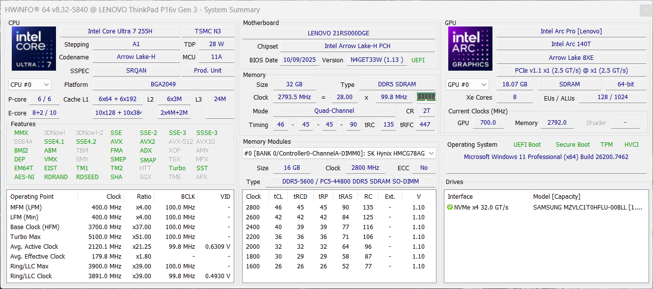 | Lenovo ThinkPad P1 Gen 8 Intel Core Ultra 7 255H ⎘ NVIDIA RTX PRO 2000 Blackwell Generation Laptop ⎘ 32 GB Memory, 1024 GB SSD | Amazon: $3,999.00 List Price: 2000 USD | 1.9 kg | 20.6 mm | 16.00" 3200x2000 236 PPI Tandem OLED | |