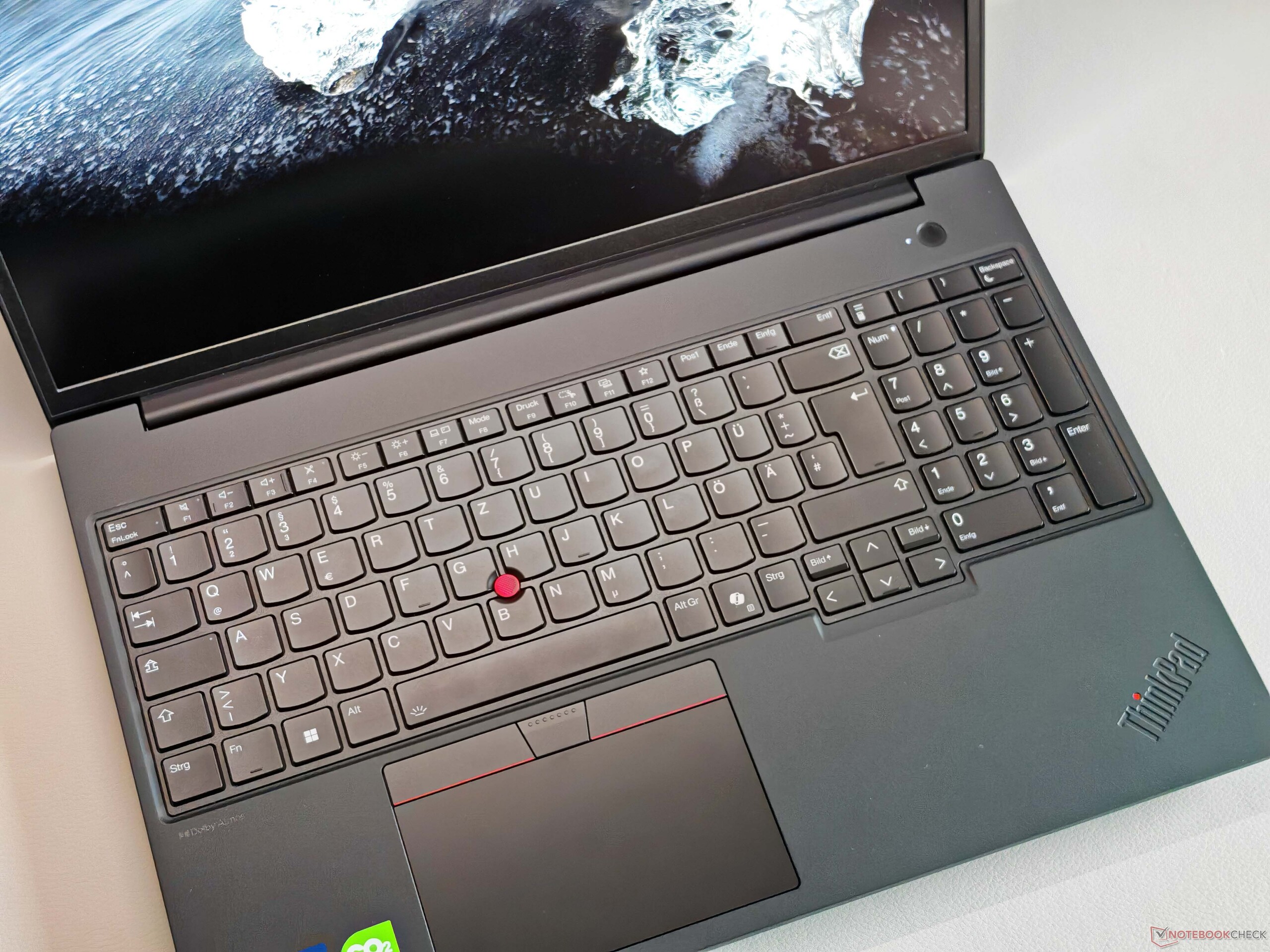The backlit keyboard including numeric keypad also meets the current ThinkPad standard, although there are significantly better models in the current line-up (e.g ThinkPad P1 16 G8). Overall, we would describe the typing feel as comfortable and precise, but the competition can do this at least as well. The ClickPad (11.5 x 6.7 cm/~4.5 x ~2.6 inches) is quite small by modern standards due to the dedicated TrackPoint buttons, but the operation is excellent and the mechanical clicks in the lower area are also extremely high-quality. This also applies to the TrackPoint buttons.