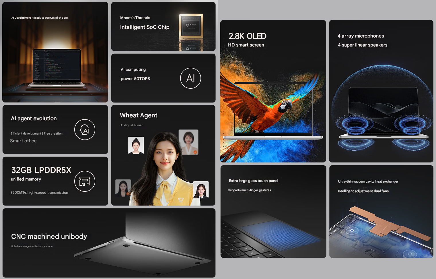 As for the other specs, it's on par with other premium productivity laptops. The MTT AIBook comes with a 1TB SSD and a 2.8K OLED display with a 120Hz refresh rate and 100% DCI-P3 color coverage. There's a quad-channel speaker setup and a dual-fan cooling configuration with a large copper heat block.