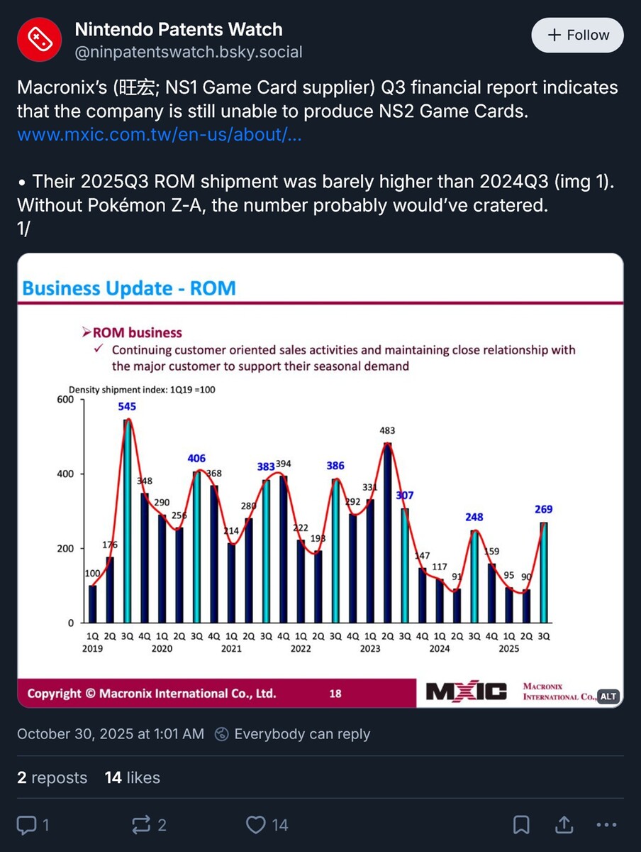 Nintendo Patents Watch on Bluesky discussed a quarterly financial report released by the Taiwanese company. The Macronix chairman cited research and development delays, which have impacted its Switch 2 plans. However, the manufacturer does have a more hopeful outlook for the "ROM business" in 2026.