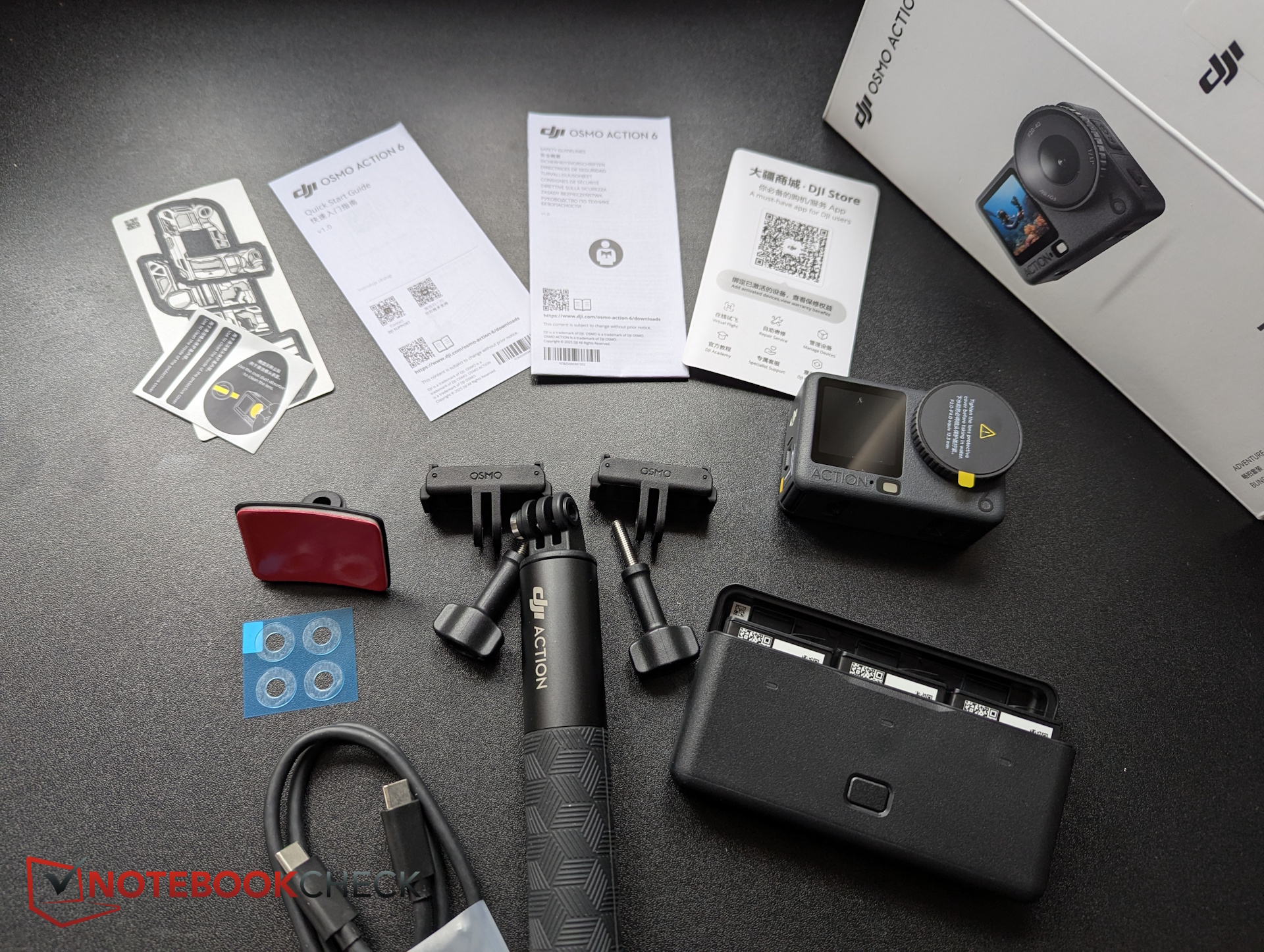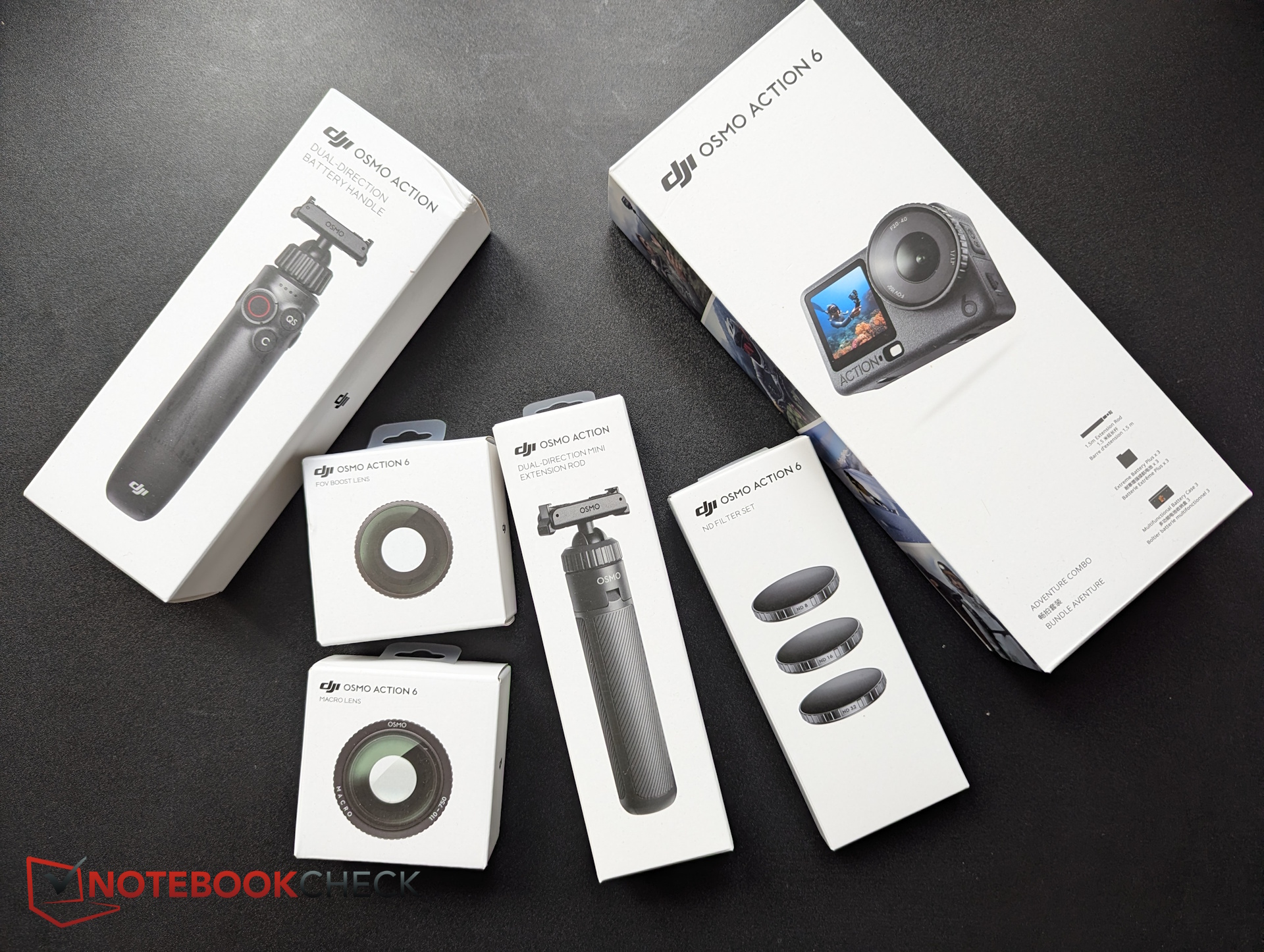 DJI sent us the Adventure Combo, which includes a 1.5 m selfie stick, three batteries, and a triple charger, plus additional accessories like the Osmo Action grip with built-in extra battery, ND filters, and macro and wide-angle lenses.