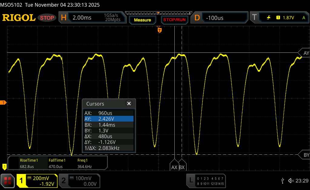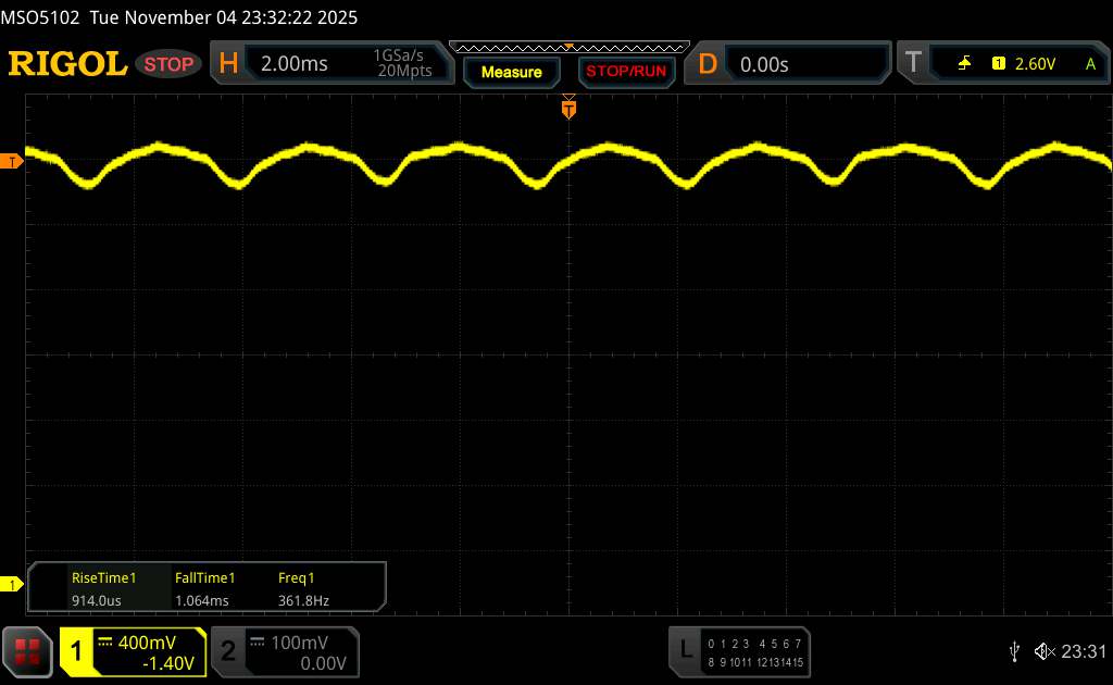 Using an oscilloscope, we measured a base flicker of around 360 Hz. In addition, Vivo uses high-frequency PWM dimming at a frequency of 2,083 Hz with the phone's display brightness set to the minnimum. This, alongside the flat amplitude curve, should help avoid any discomfort for most people, but this can't be completely ruled out for sensitive individuals.