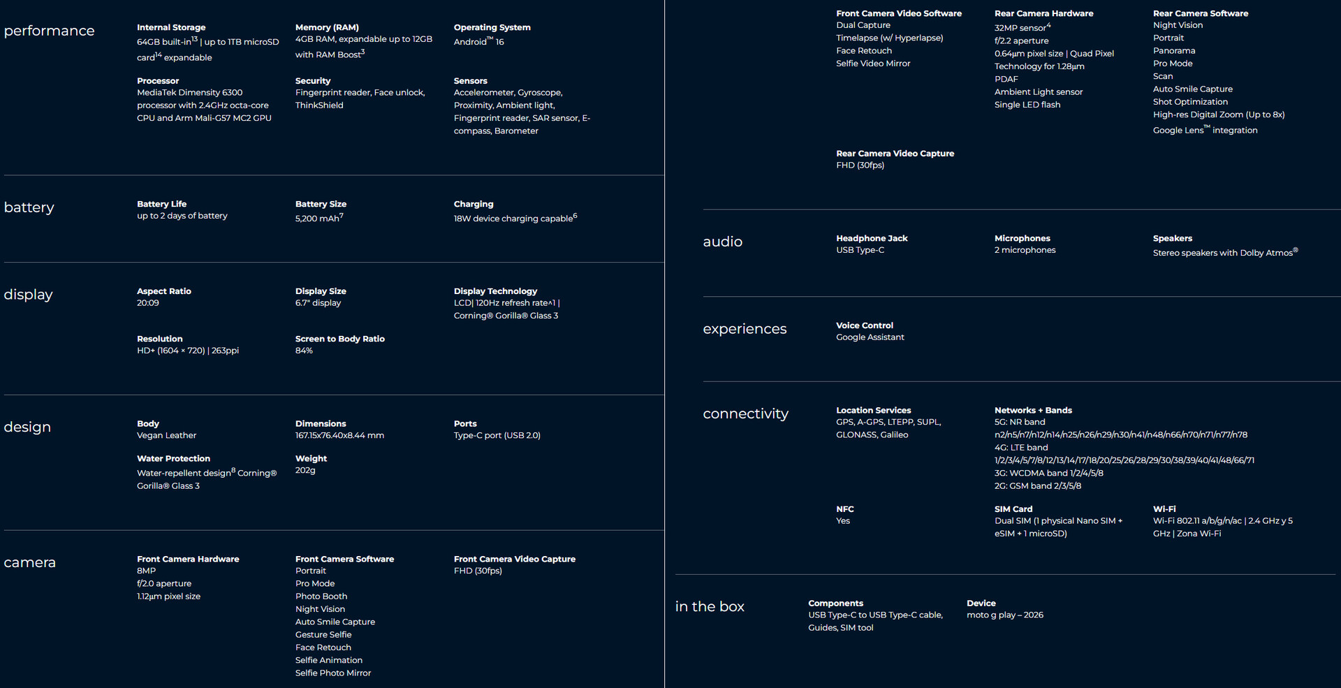 Like the non-Play variant, the Moto G Play (2026) is powered by the Dimensity 6300, a mid-range SoC from 2024. It's paired with 64 GB of UFS 2.2 storage and 4 GB of RAM. Motorola is offering the option to extend the latter with a virtual RAM boost feature, allowing up to 8 GB of additional memory. There's a microSD slot available, allowing users to install up to a 1 TB card (SanDisk 512GB Ultra curr. $37.99 on Amazon).