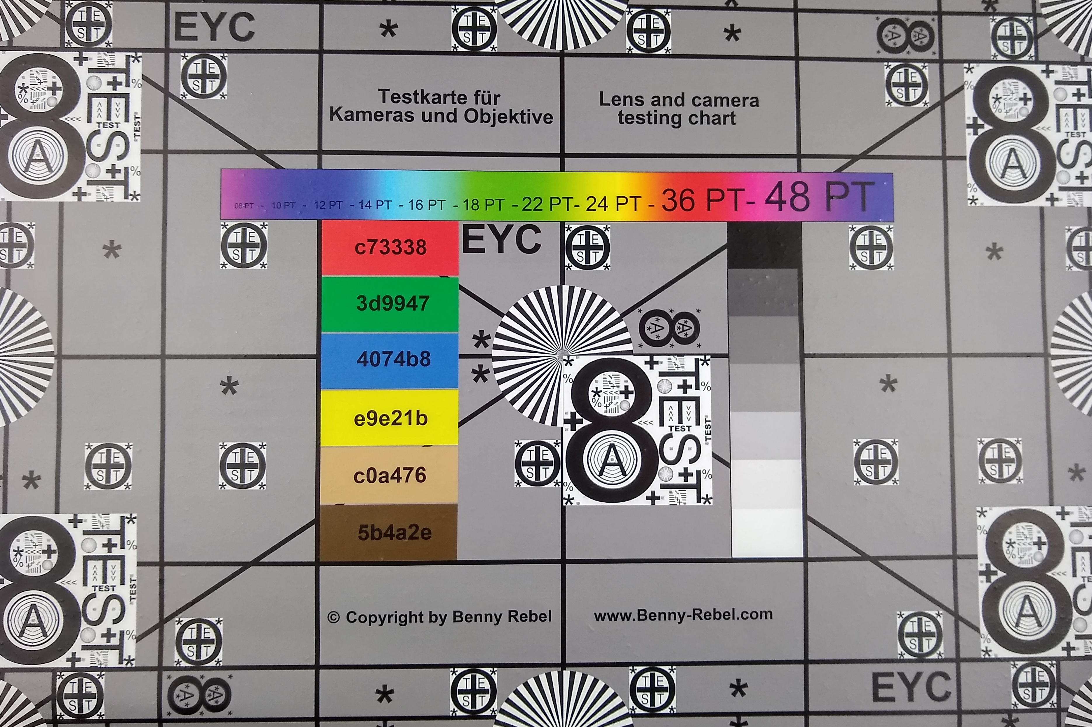 The main camera also needs to prove itself in the lab under controlled light conditions. Unfortunately, the test chart we photographed is reproduced with significantly more blurriness towards the edges, and text in front of colored background appears slightly blurry in parts. However, overall the quality of the image is also at a good level. To a large extent, colors are reproduced too bright, and the color areas are partly splotchy.