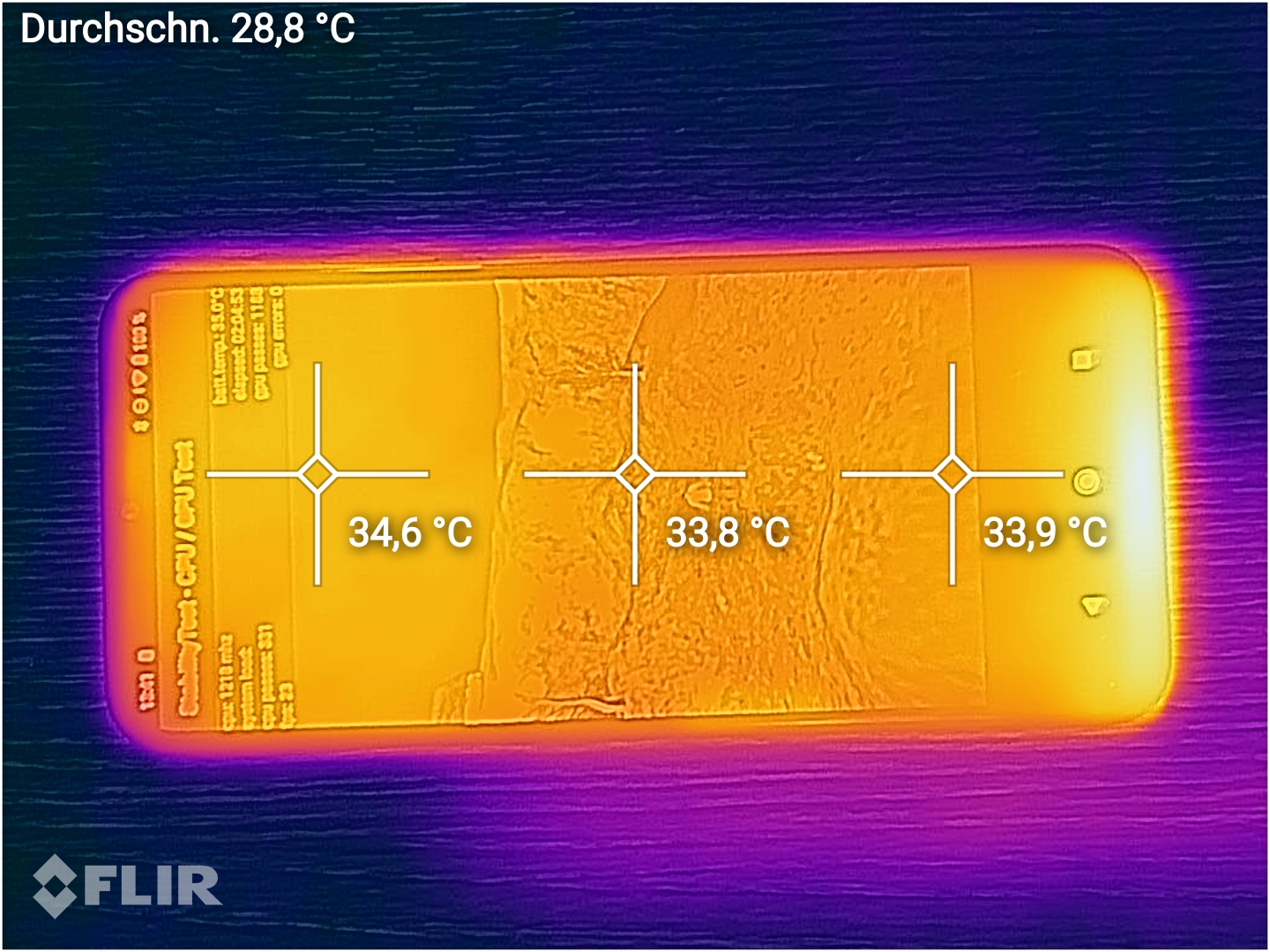 (±) In idle usage, the average temperature for the upper side is 33.5 °C / 92 F, compared to the device average of 32.9 °C / 91 F.