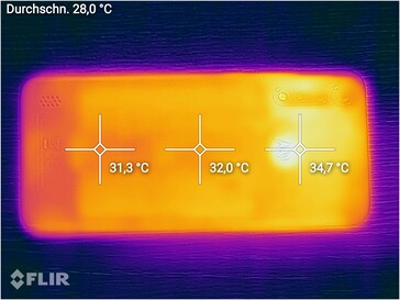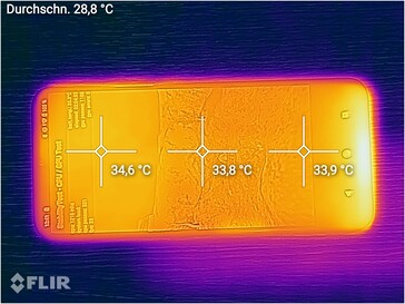 (+) The maximum temperature on the upper side is 37.4 °C / 99 F, compared to the average of 35.2 °C / 95 F, ranging from 21.9 to 247 °C for the class Smartphone.