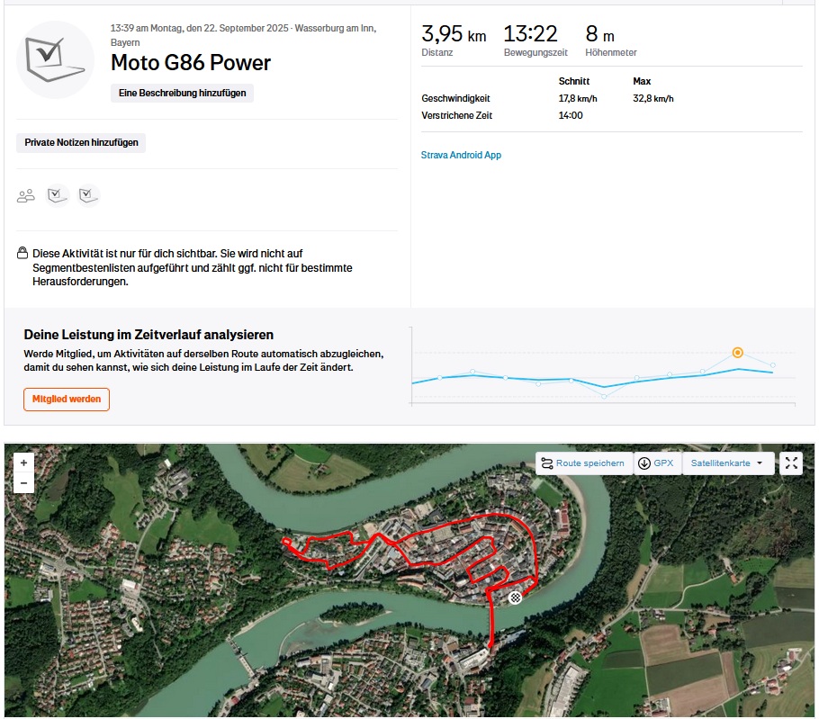 Outdoors, the Moto G86 Power quickly fixes its position to within about three metres. During our cycling test, location accuracy was occasionally a little off, but the smartphone is still accurate enough for everyday navigation.