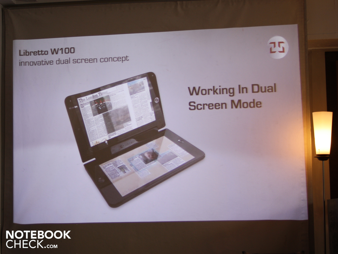 In any event, the Libretto W100 is versatile. It can be held vertically like a book and thus be used as an e-book reader. This way, for example, two pages of a newspaper can be read. Horizontally, documents can be read on the upper screen, whilst the bottom screen is used for newspaper cuts and brainstorming. But where can you write? The lower screen can be utilized as a virtual, full-sized keyboard. Now, supported by a sensory feedback while typing on the displayed keys (Forced Feedback), you can work with a notebook. A pen input on the screen isn't intended, though. Alternately, it's possible to extend the upper screen over the second one, in order to receive a larger view (1028 x 1200). Contents, documents and symbols are pulled from one screen to the other via drag and drop. A finger action in the direction of the second screen is enough. However, the relatively large gap between both screens in an opened state is annoying in this mode.