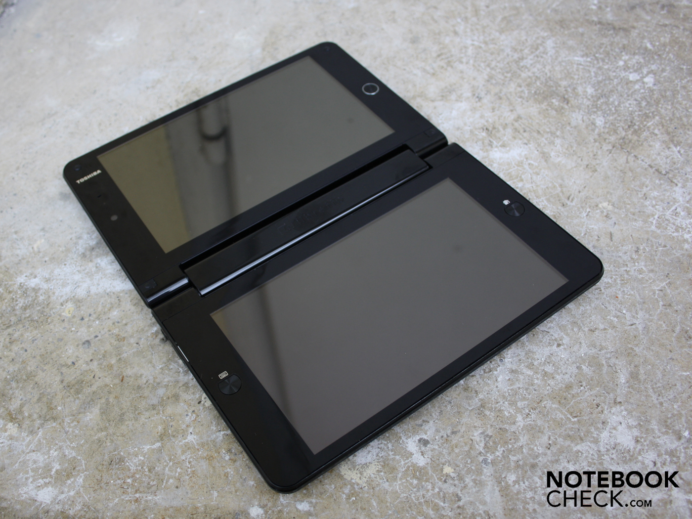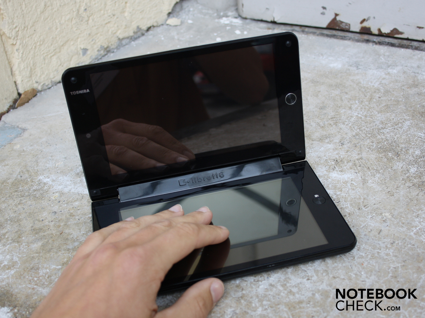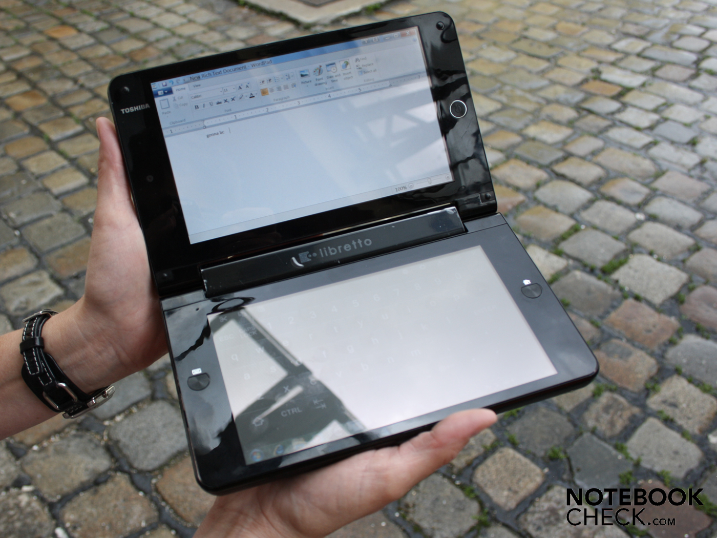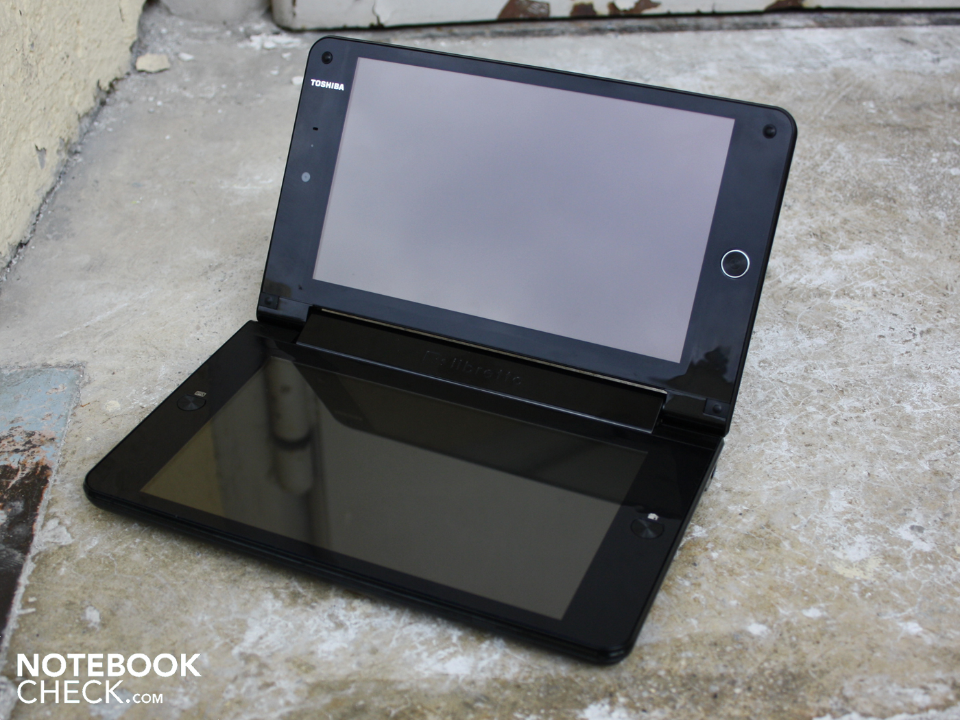 The Japanese design department obviously wants to show what it's capable of. The foldable 7 incher is made with two touch screens (both 102x768) and doesn't have a real keyboard. The name Libretto builds on an 840 gram mini-notebook that Toshiba launched in 1996. The 6.1 incher was very successful and a real high-end product at the time (AMD 486 DX4 to Pentium 233).