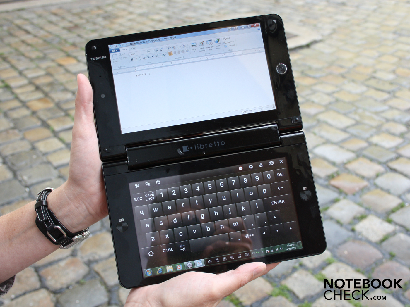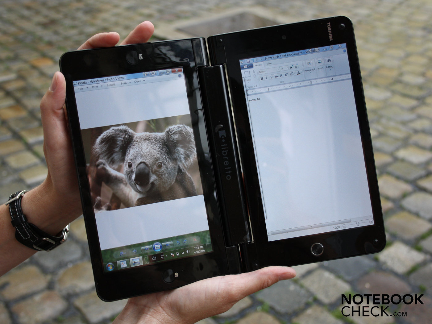 The Libretto is technically equipped like a ULV notebook (Pentium U5400, 62 GB SSD). Thus, the rate is sufficient for the use of Windows 7 Home Premium. The pre-series device with a weight of 819 grams was comfortable to handle, but got very warm. The fan, even if very quiet, emitted hot air permanently out of the case. The reason for the warm device is the large amount of waste heat from the components in the subnotebook. Thus, the dual book is considerably more potent than, for instance, Intel Atom netbooks. In return the battery life is shorter. The manufacturer states of only three hours with the 8 cell battery.