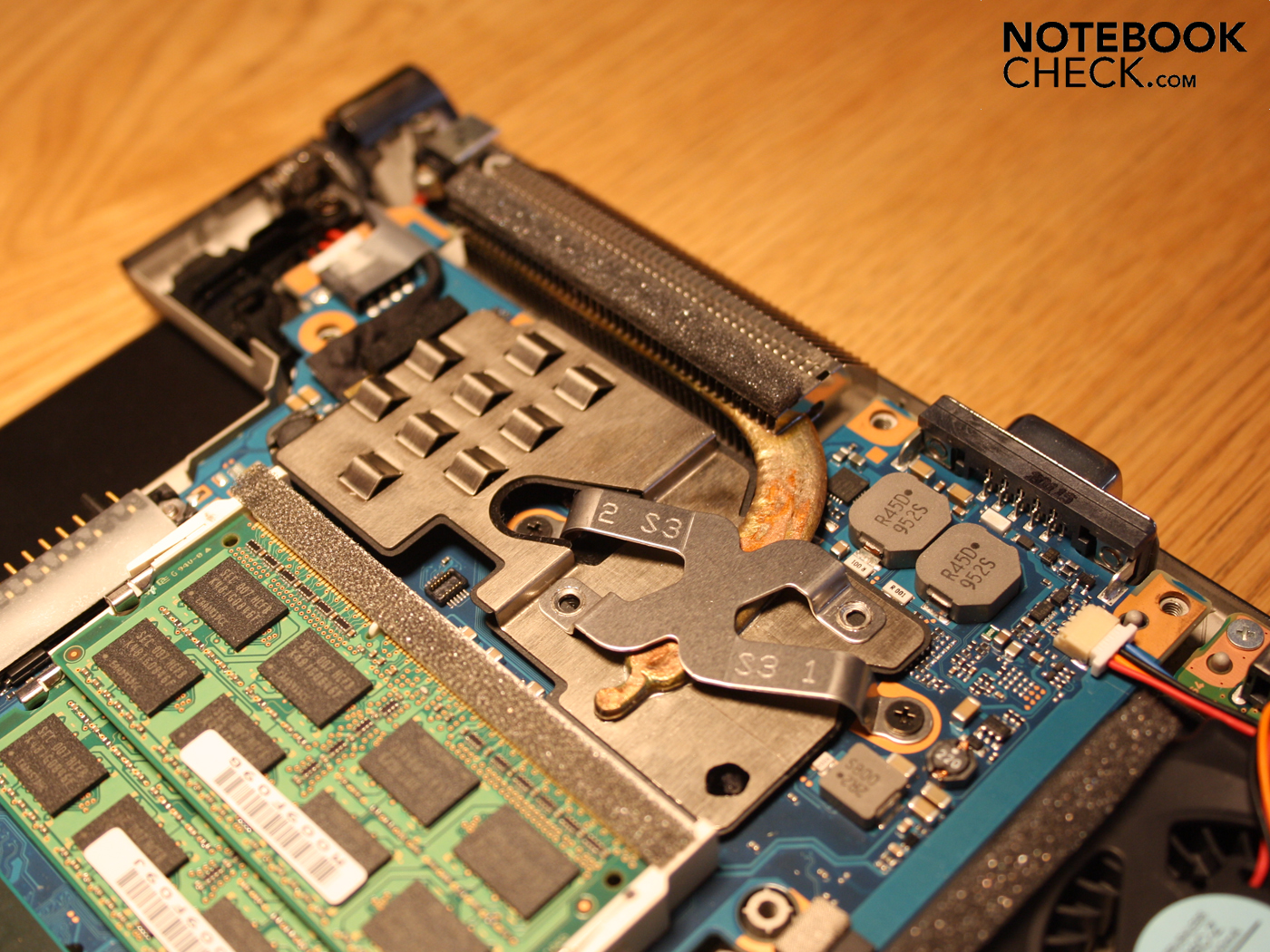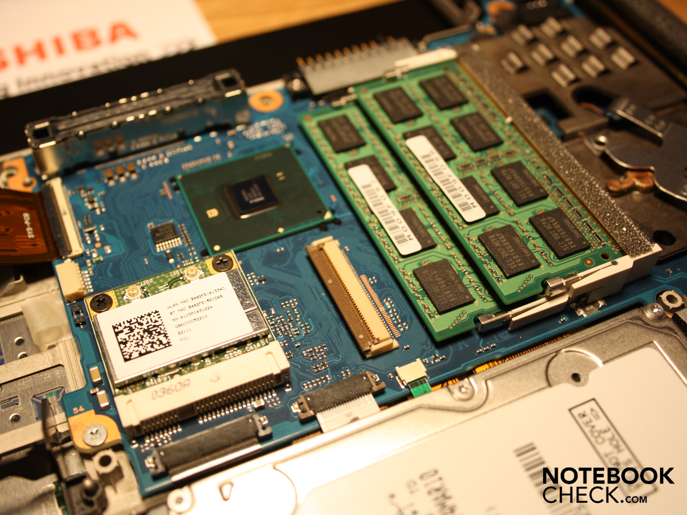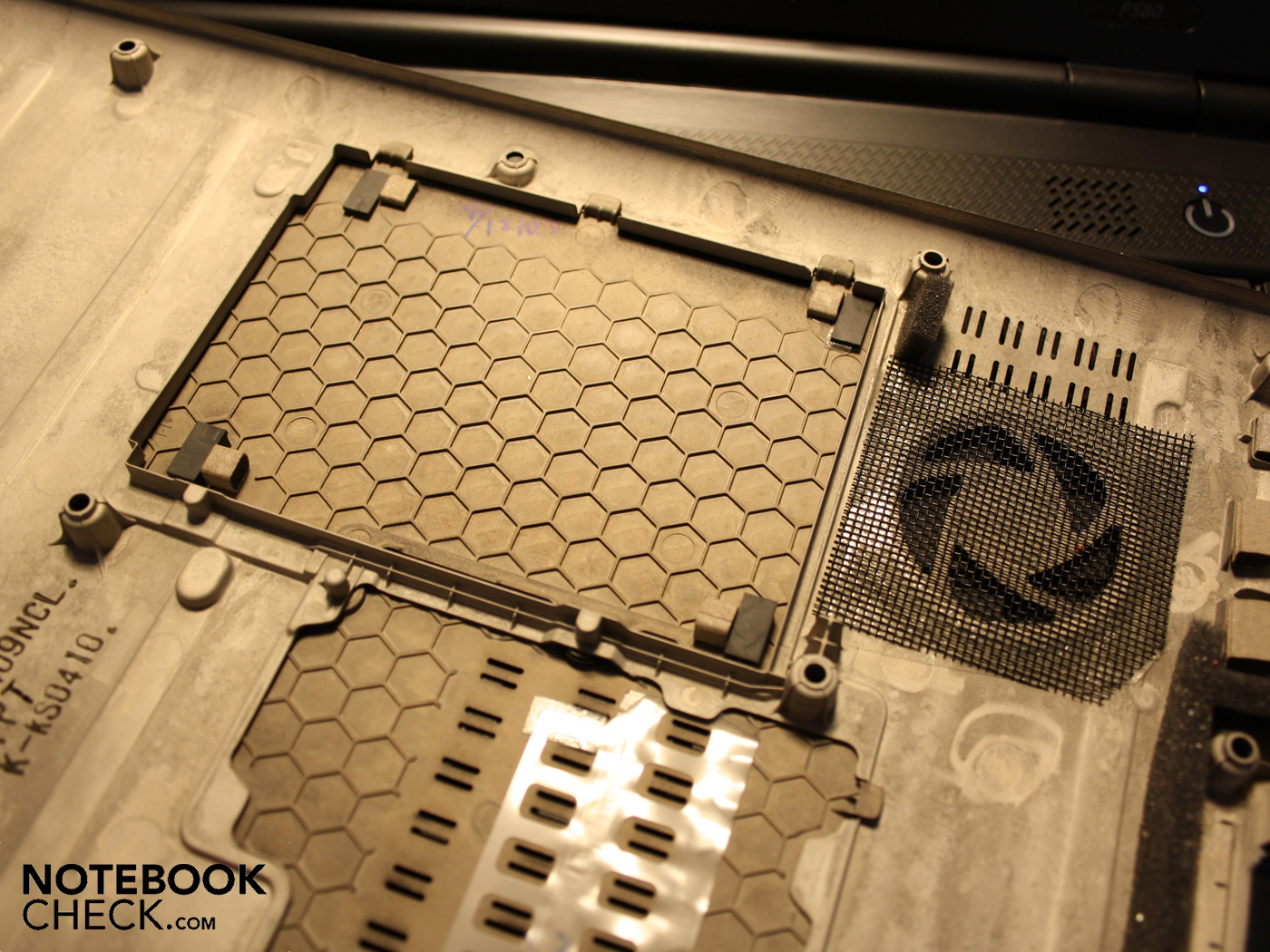 A honeycomb-like interior structure of aluminum-magnesium components (Honey Comb Structure) takes care of the chassis' stability. The notebook is stiffer, despite the low material thickness due to it. We could look at the disassembled R700 extensively. The term "stiff" has to be seen relatively. The R700 is miles away from the torsional stiffness of a MacBook. In return, it also weighs a lot less than its Apple colleague with 1.4 kilograms (with DVD drive). 1.4 kilograms is about the weight of a 10 inch netbook with a strong battery.
