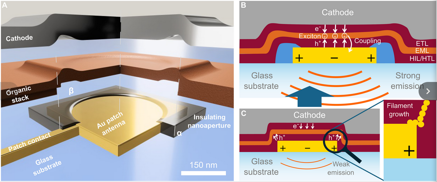 The German researchers published their findings in the Science Advances journal, where they note that the 300 nm² pixel emits orange light and is just as bright as a conventional 5 nm² OLED. However, simply shrinking the light-emitting diode would not allow for reliable efficiency. The scientists needed to implement a gold cuboid antenna measuring 300 x 300 x 50 nm and also had to make sure the electric field currents do not force the gold atoms to branch out into the optically active material and eventually short circuit the entire pixel structure. For this, the researchers designed an insulation layer on top of the antenna, which leaves a circular opening with a 200 nm diameter in the center of the antenna.
