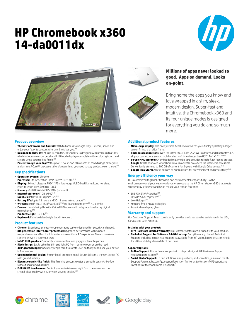 With its four unique positions, the Chromebook x360 offers versatility in how a Chrome OS device can be used, making it ideal for productivity and entertainment. With a Chromebook convertible, consumers get all the great benefits of Chrome OS: an easy-to-use, stable, speedy and secure computing experience.