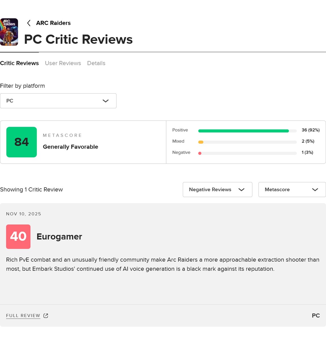The Embark Studios extraction shooter Arc Raiders has exceeded expectations for player counts. Media opinions are also positive, with an 84 Metacritic rating. However, one score sticks out like a sore thumb, as the only negative Arc Raiders review on the aggregator. Eurogamer awarded the game a 2/5 rating, primarily due to its use of generative AI.