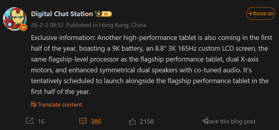 The tipster didn't reveal the name of this Legion gaming tablet rival, but shares that it's expected to feature the same flagship-grade processor, which is reportedly the Snapdragon 8 Gen 5. This SoC can offer better performance than the Snapdragon 8 Elite and is already powering devices like the OnePlus 15R and Motorola Signature.
