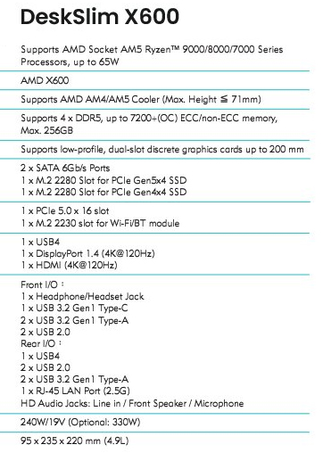 ASRock seems to be gearing up to launch new mini PCs, and among them is the AMD-powered DeskSlim X600. A spec sheet of the system has emerged, and it suggests that the compact PC will have support for AM5 desktop processors, starting from the Ryzen 7000 series to the 9000 lineup.