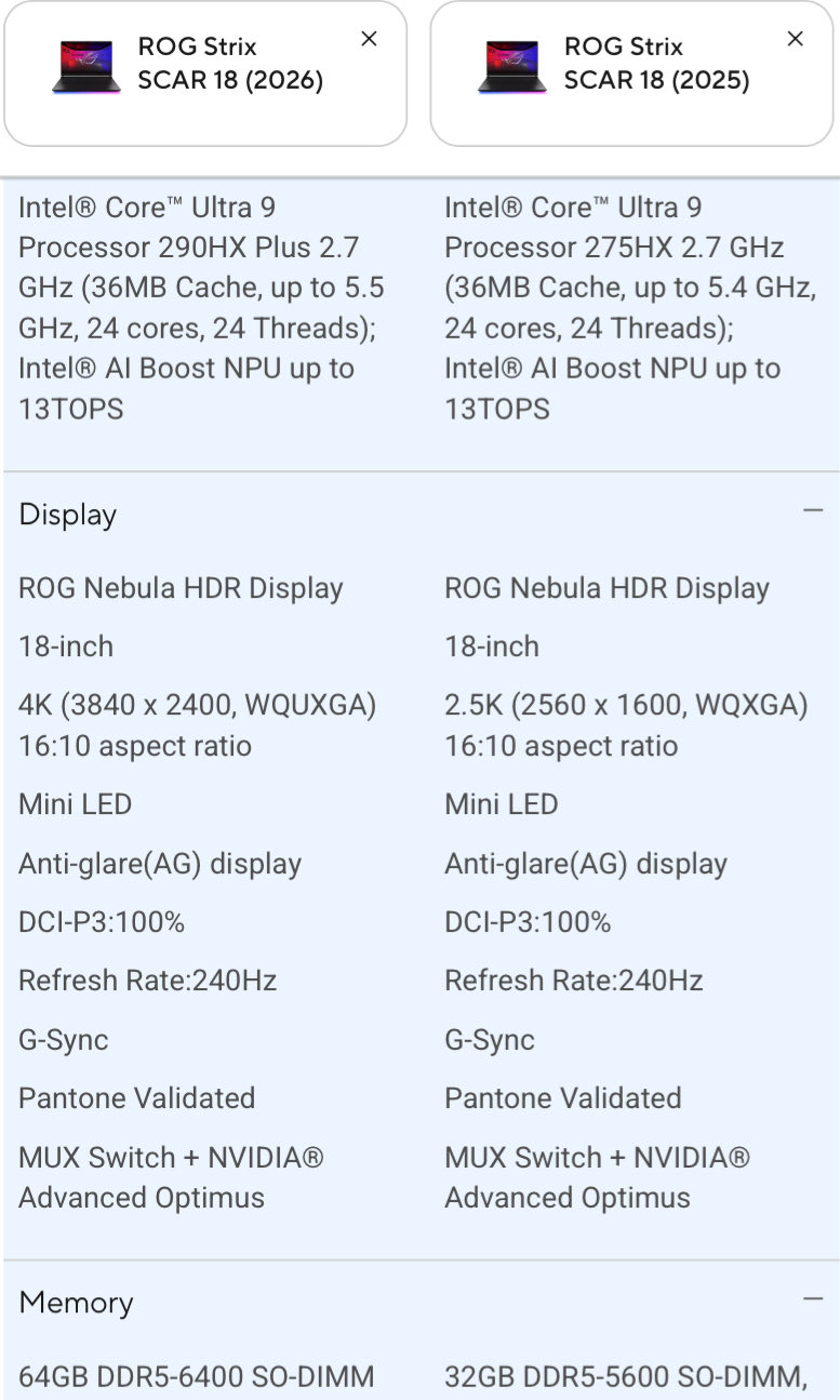 On the other hand, Asus will also equip the new ROG Strix Scar 18 with a 4K Mini LED display. Outputting at 3,840 x 2,400 pixels in a 16:10 aspect ratio, this new panel will maintain the 240 Hz refresh rate and 100% DCI-P3 colour space coverage of last year's 2,560 x 1,600 display. All this hardware will be rounded off with the Intel Core Ultra 9 290HX Plus and the Nvidia GeForce RTX 5090 laptop GPU. Pricing remains unknown at this stage.