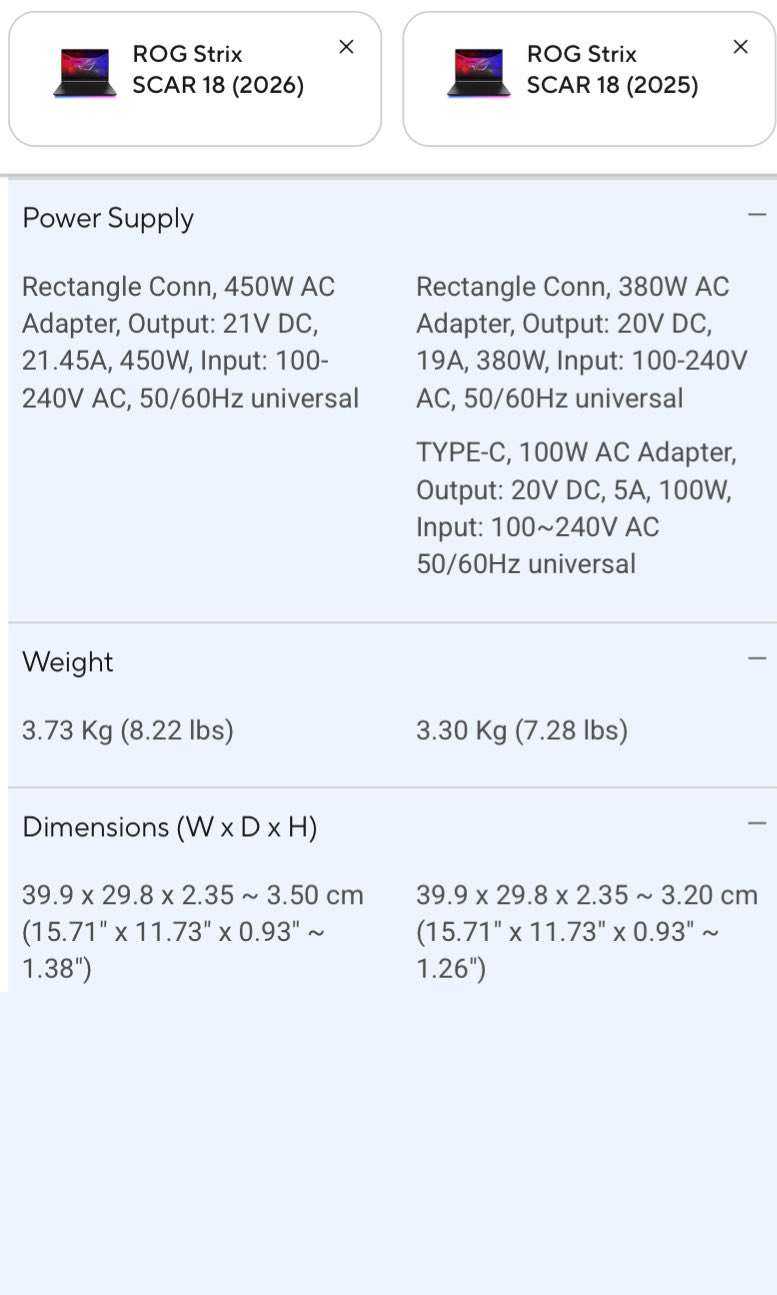 On the one hand, the leak indicates that the ROG Strix Scar 18 (2026) will draw up to 450 W via a new AC adapter. Still a rectangular connector, the new power adapter has been billed as allowing the new Strix Scar 18 to fully stretch its legs' unlike its predecessor. The comparison image also highlights that the 2026 model weighs 430 g more than its predecessor. Thus, it seems likely that Asus has installed a beefier cooling solution too, although we encountered no issues when reviewing last year's model.