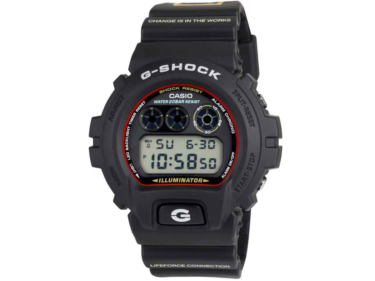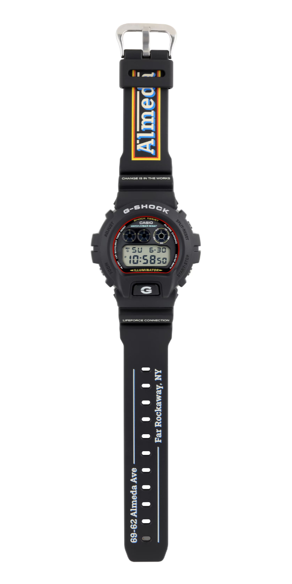 The DW6900RL-1AC’s design is very close to that of the DW6900RL-1 (curr. $85.49 at Amazon Marketplace). The Almeda Club version has a matte black resin casing and strap, with similar red, white and blue accents on the dial. Plus, the matching resin strap features the Almeda logo, its address, and the text “change is in the works” and “lifeforce connection”.