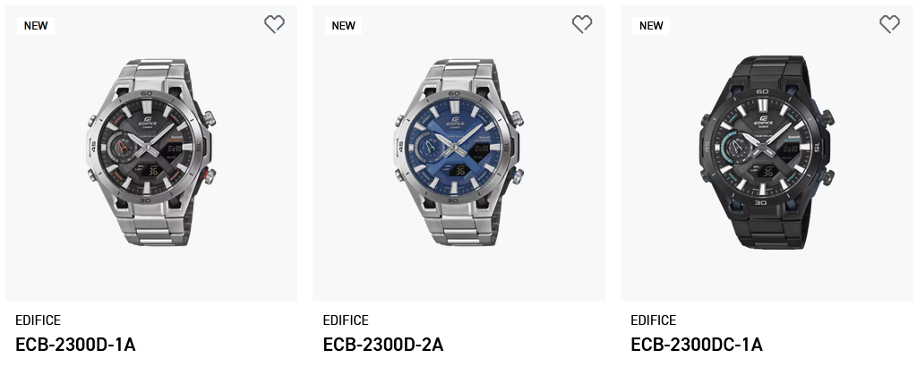 Casio has added three Edifice Sospensione ECB-2300 references to its international website: ECB-2300D-1A, ECB-2300D-2A, and ECB-2300DC-1A, indicating a broader rollout beyond Japan. Dedicated product pages for the stainless models (D-1A, D-2A) and the black‑ion version (DC-1A) are now live on the global site.