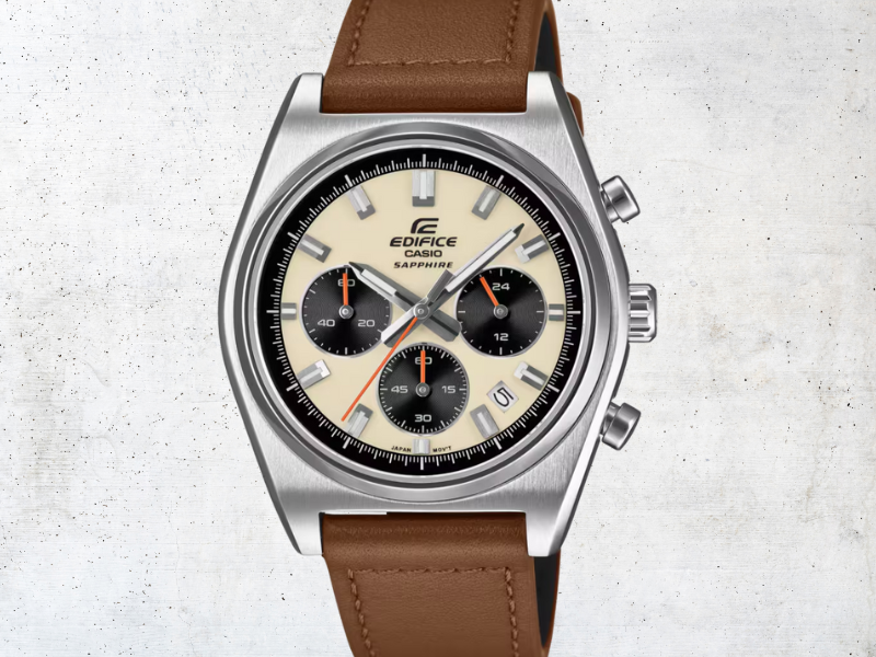Casio’s Edifice EFB-730L-7AV has a cream watch face, sporting three analog hands, a basic date display and a trio of indicator dials. Two of the latter are linked to the 1-second stopwatch tool, with the last indicator showing the time in a 24-hour format. The face is surrounded by a silver colored stainless steel casing, measuring 47 x 40 x 11 mm (~1.9 x 1.6 x 0.4 inches), and there is a protective sapphire crystal glass.