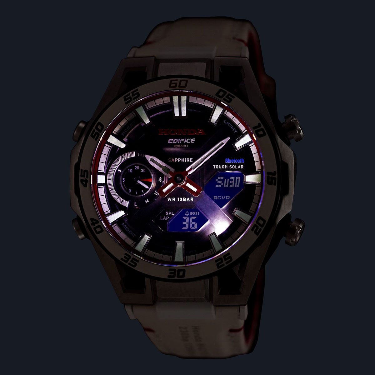 Many design details directly reference Honda’s motorsport heritage. The standout white ceramic bezel is the same color as Championship White - the official victory color of Honda cars, also with a gold-accented "60" to mark the milestone year. The bezel scale counts up in five-second increments, which is a neat detail not found on base ECB-2300 models.