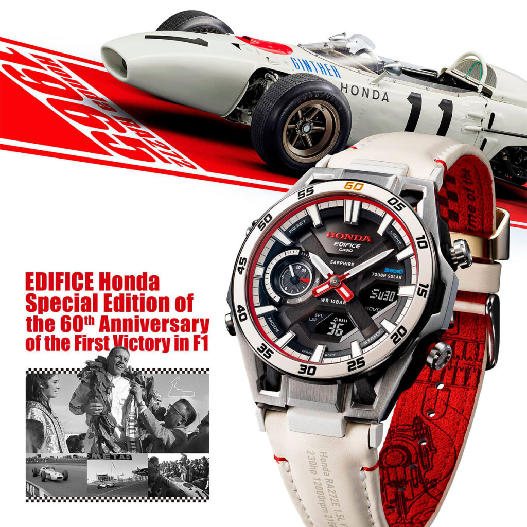 Amid a slew of new Casio watches arriving this fall, the Japanese timepiece manufacturer has now introduced the ECB-2300HR-1A, a special Edifice Honda model commemorating the 60th anniversary of Honda’s first Formula 1 Grand Prix victory. It's a limited-edition model, and it takes vintage (and technical) inspirations from Honda’s 1965 F1 win in Mexico with the RA272, the first Japanese car and team to triumph at that level.